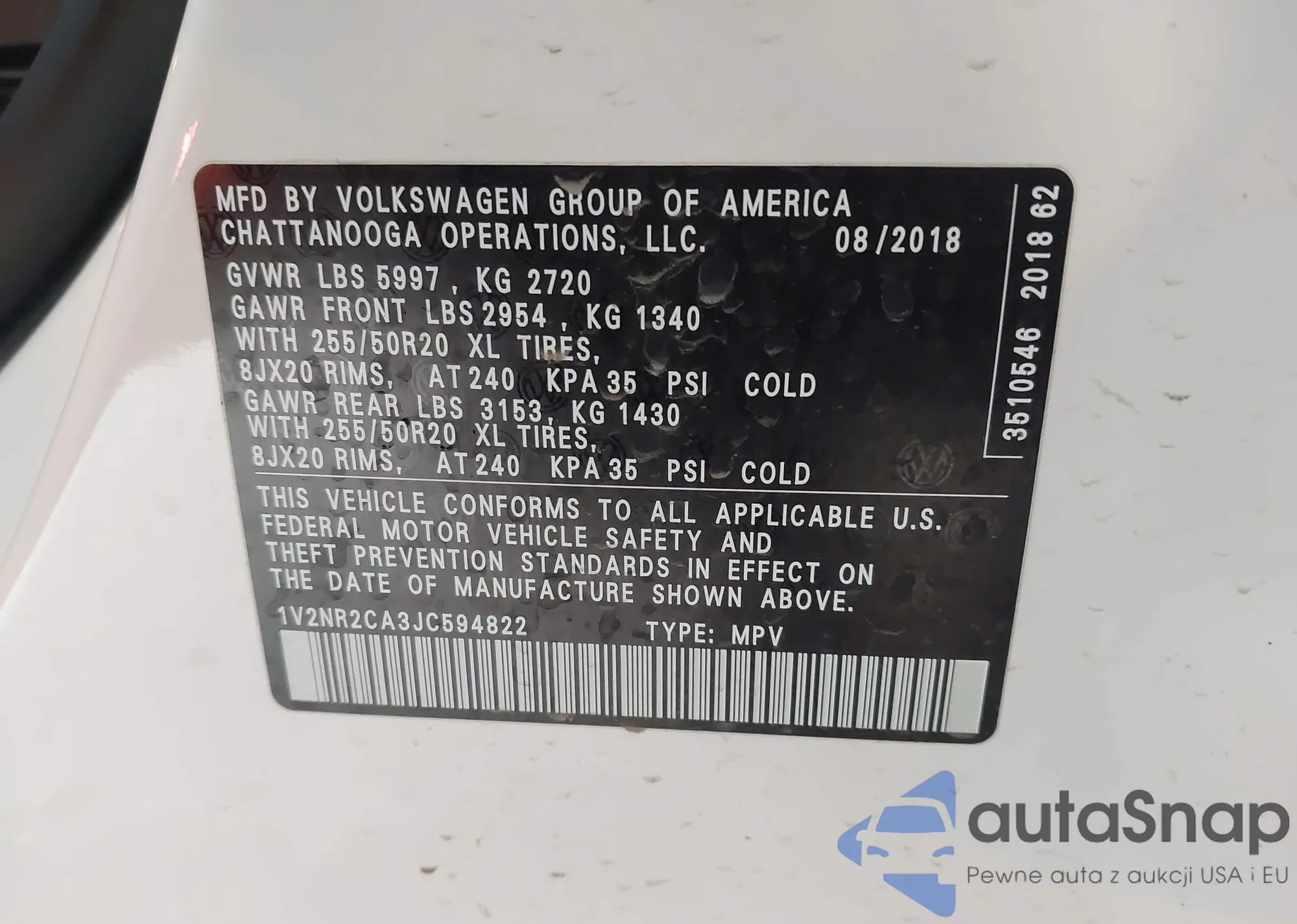 LOT: 42368854 VIN: 1V2NR2CA3JC594822