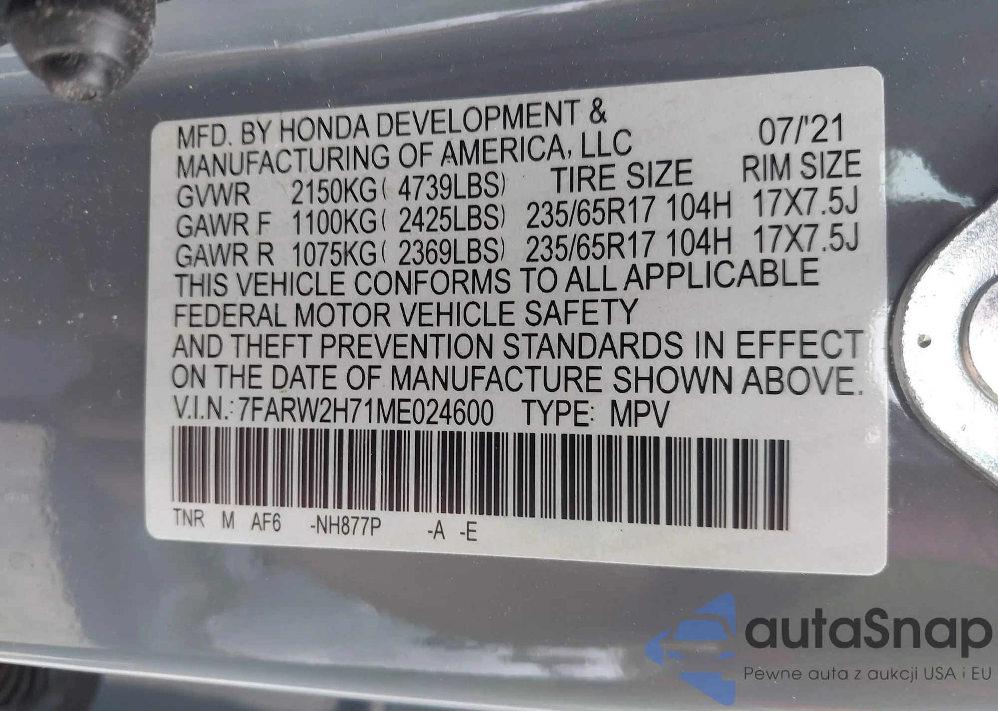 LOT: 42634169 VIN: 5FNRL38447B118071
