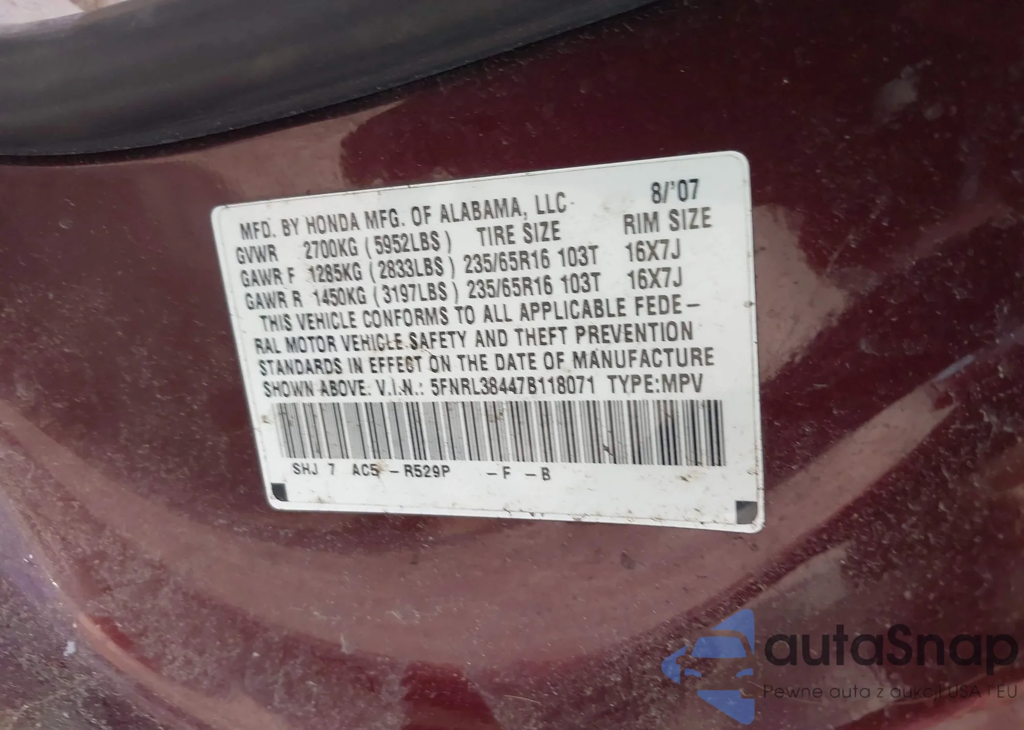 • VIN 5FNRL38447B118071