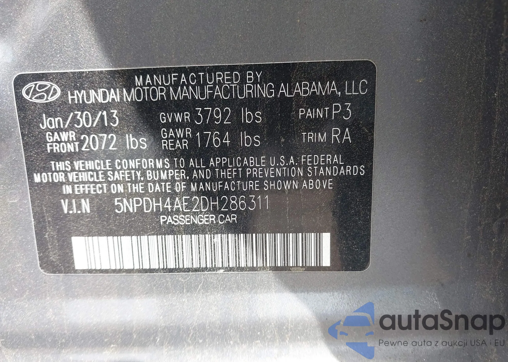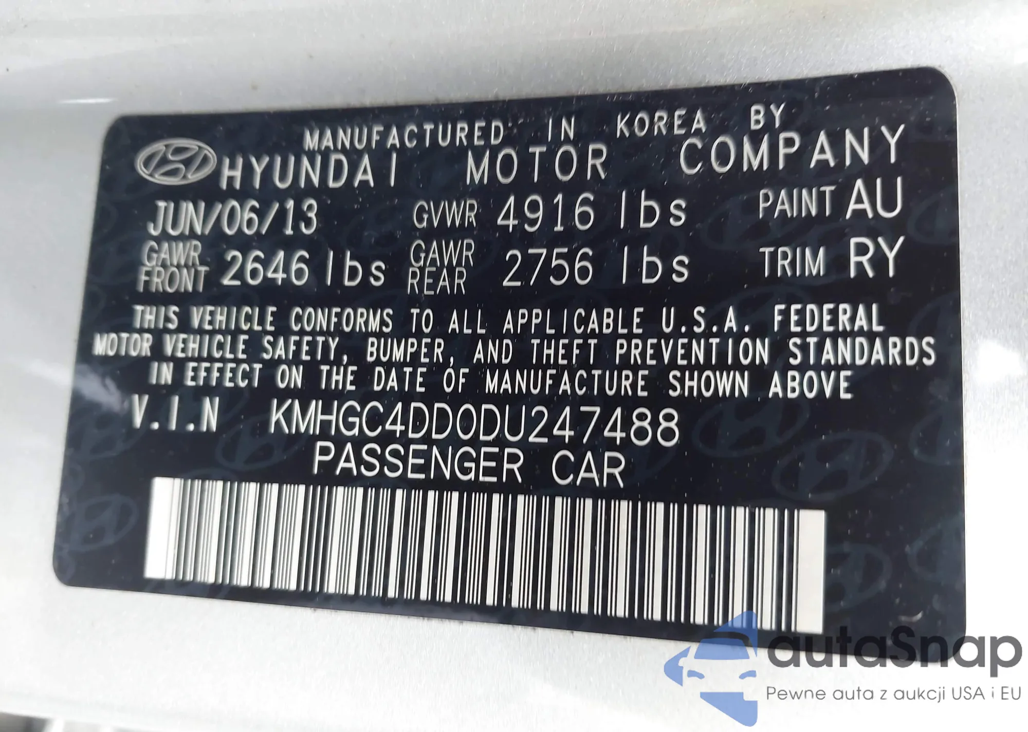 LOT: 42527738 VIN: KMHGC4DD0DU247488