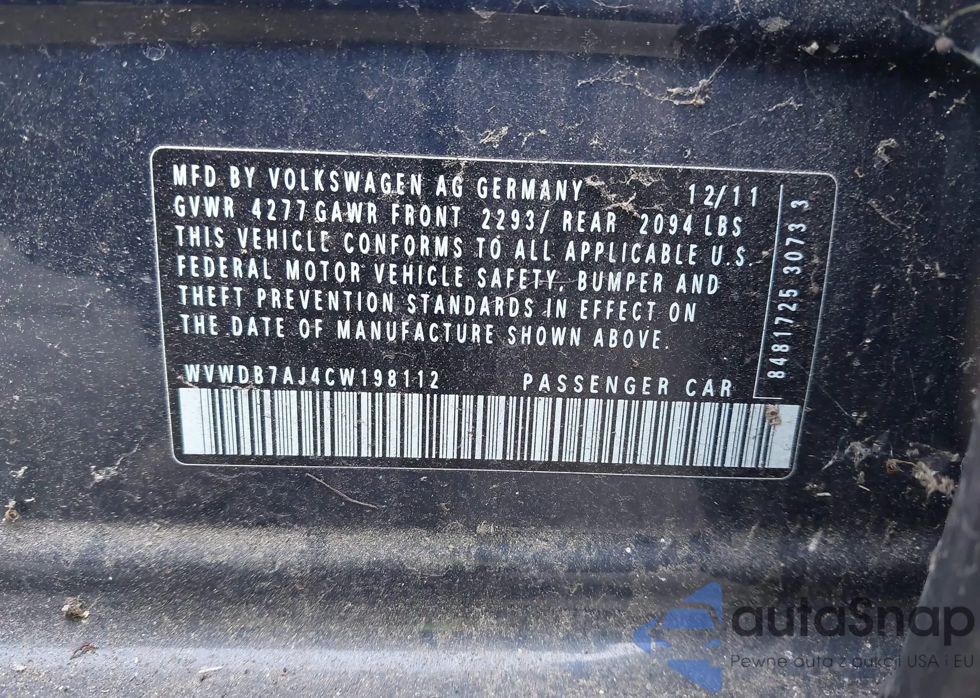 LOT: 42521399 VIN: WVWDB7AJ4CW198112