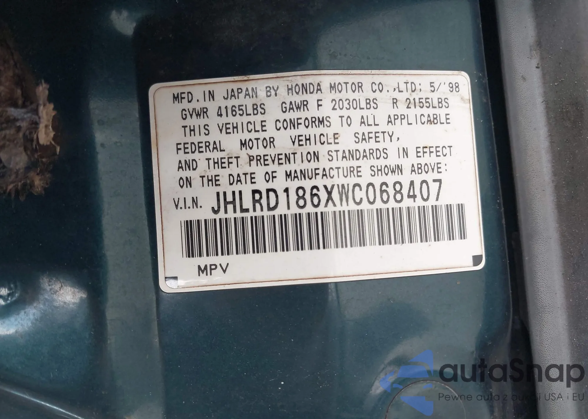 • VIN JHLRD186XWC068407