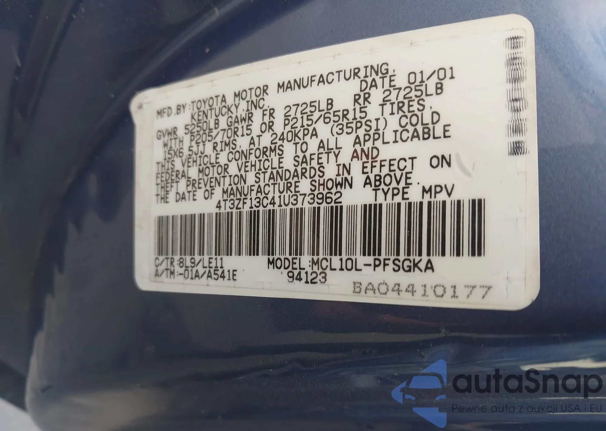 • VIN 4T3ZF13C41U373962