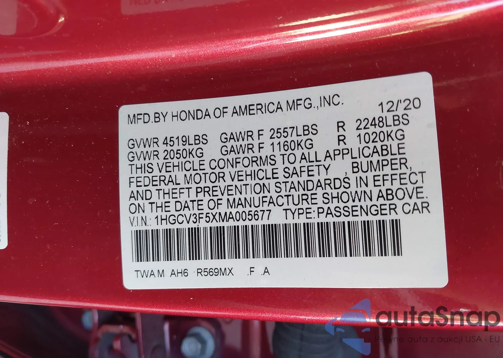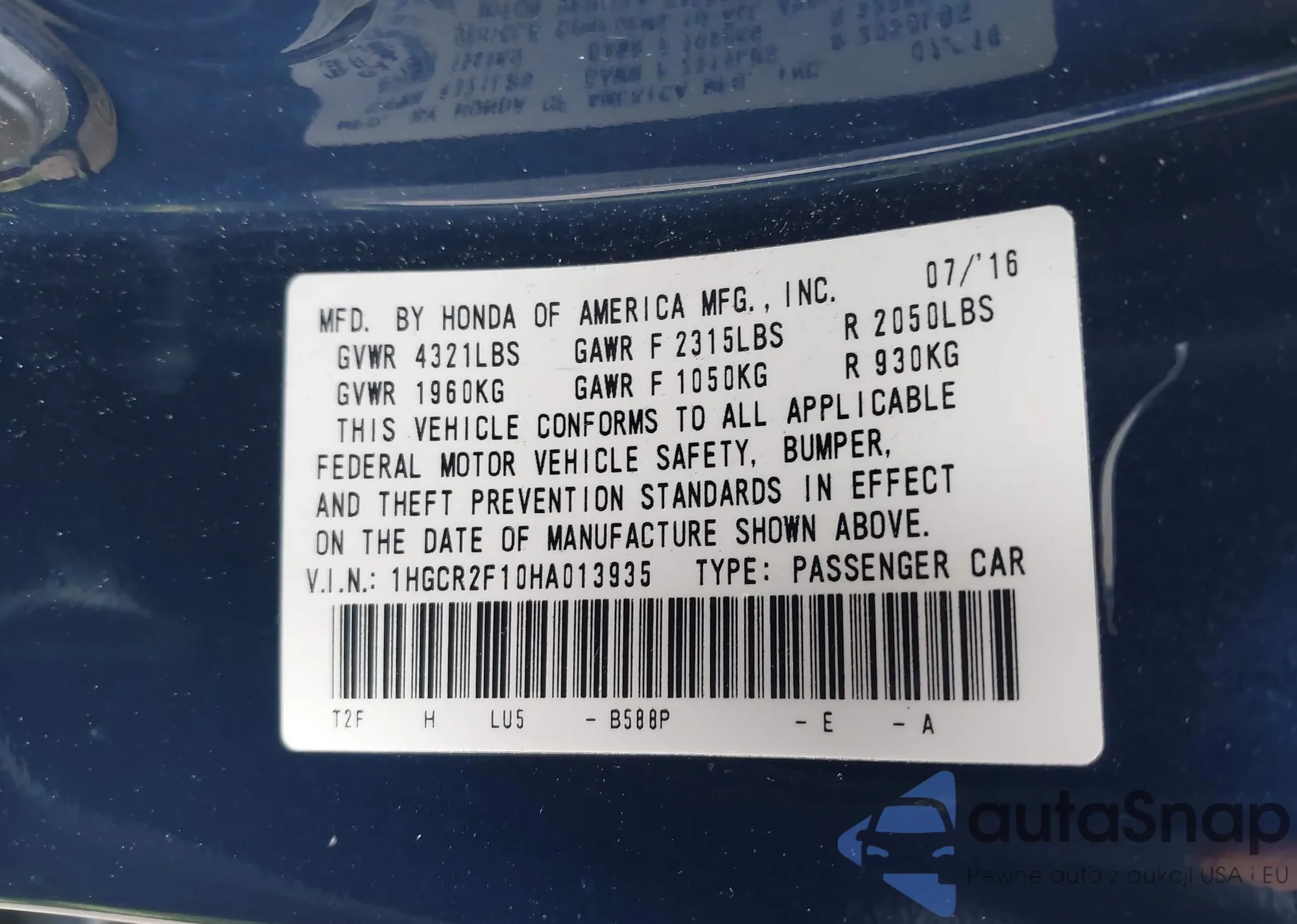 LOT: 41935395 VIN: 1HGCR2F10HA013935
