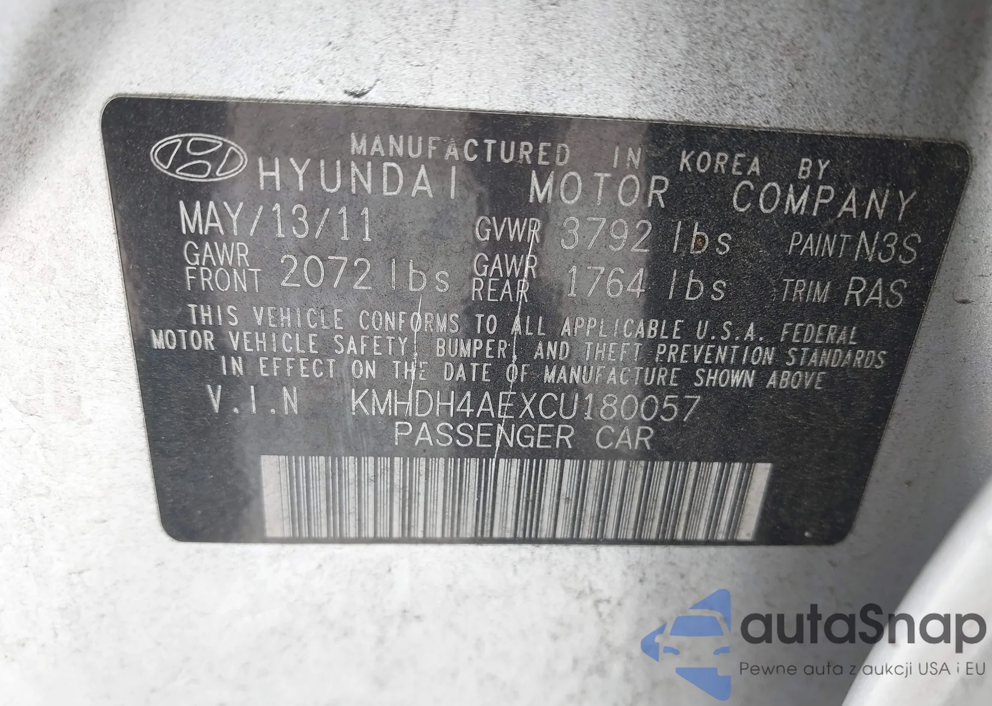 LOT: 42538501 VIN: KMHDH4AEXCU180057
