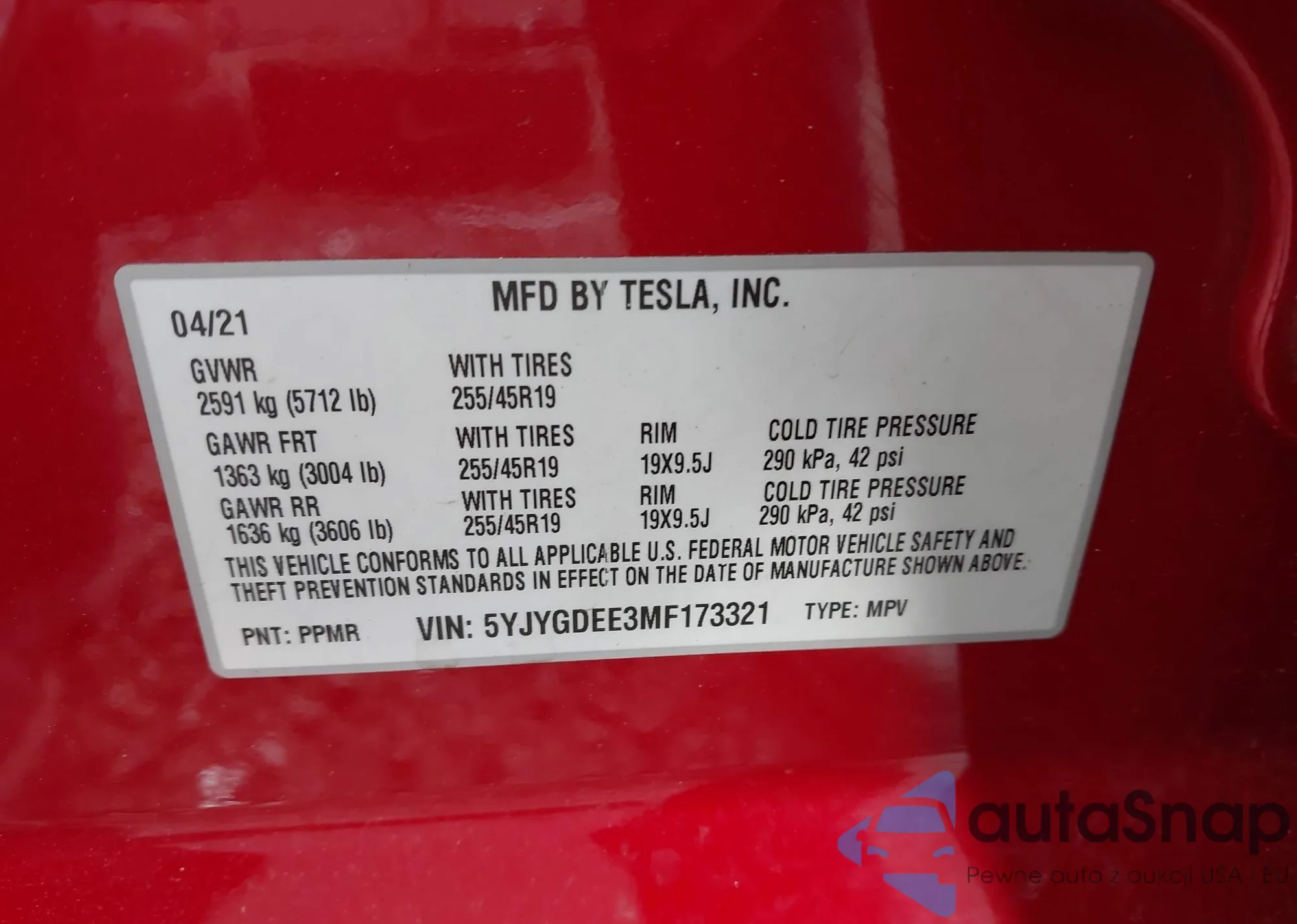 LOT: 42163343 VIN: 5YJYGDEE3MF173321