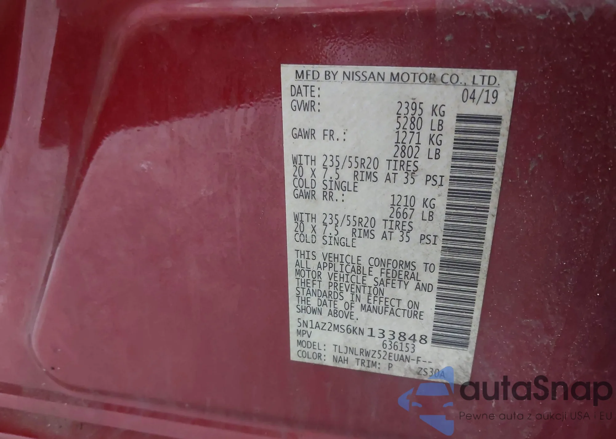 • VIN 5N1AZ2MS6KN133848
