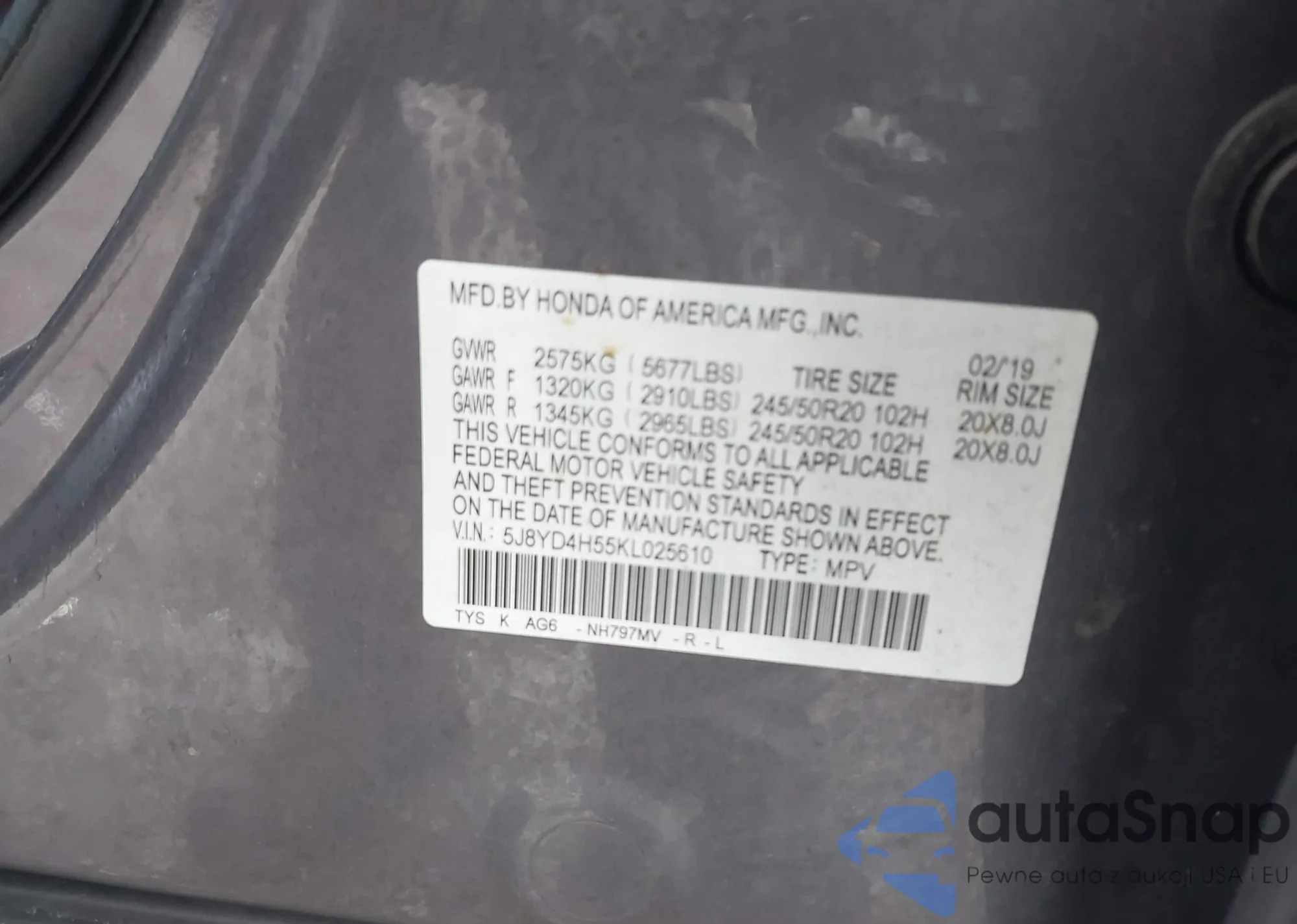 LOT: 41966324 VIN: 5J8YD4H55KL025610