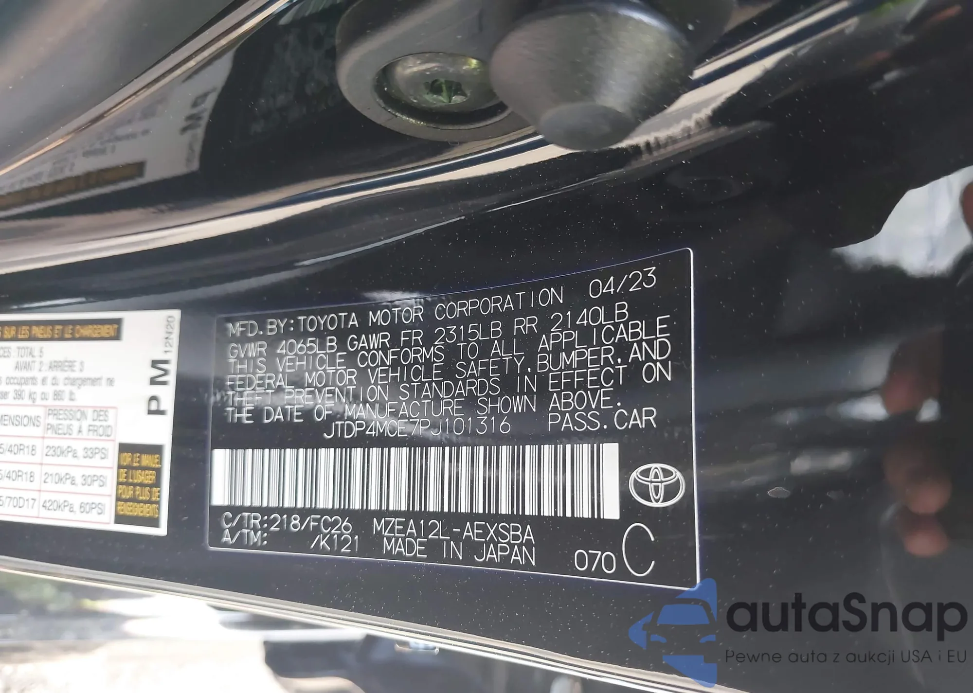 LOT: 42015218 VIN: JTDP4MCE7PJ101316