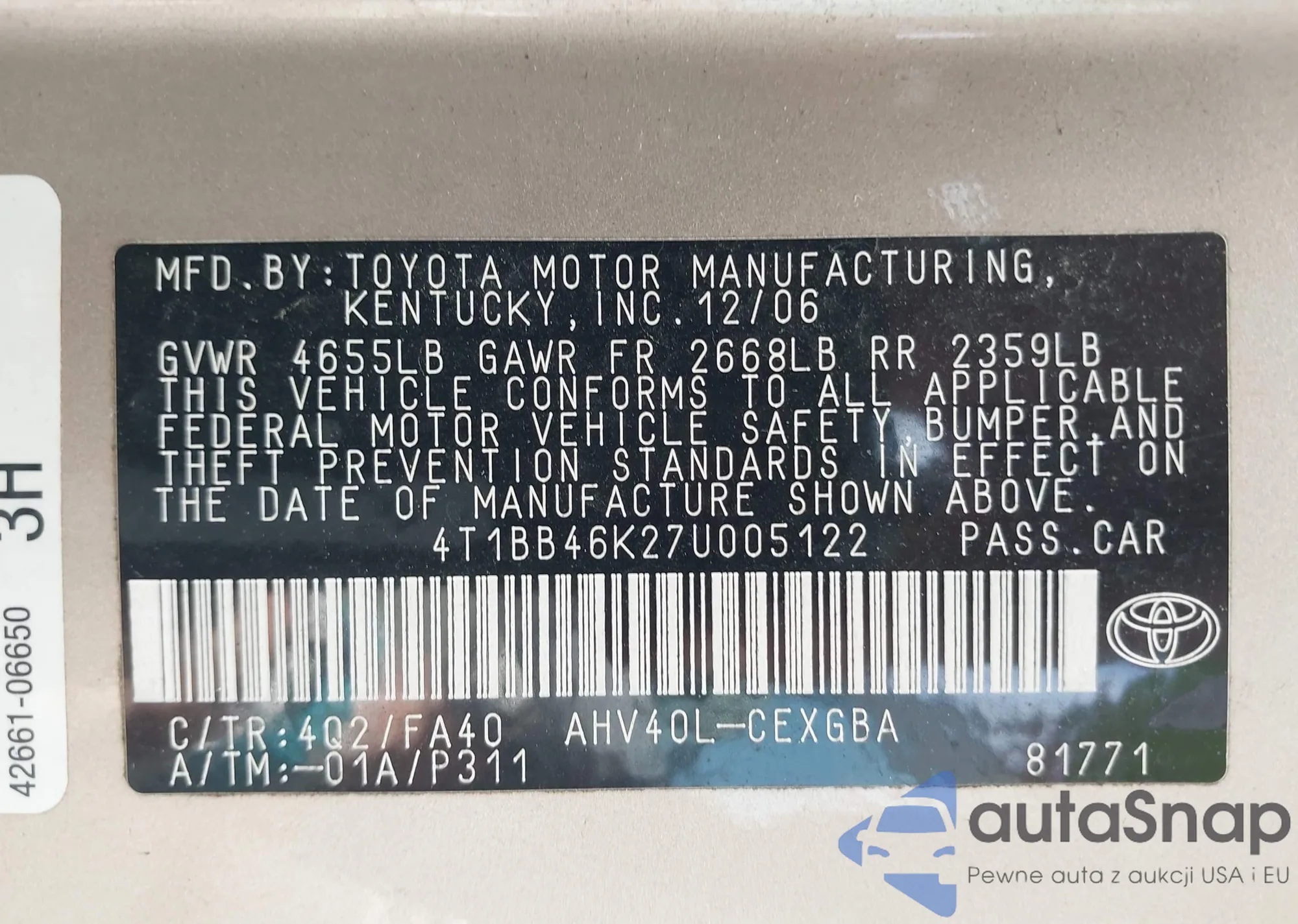 LOT: 42478812 VIN: 4T1BB46K27U005122