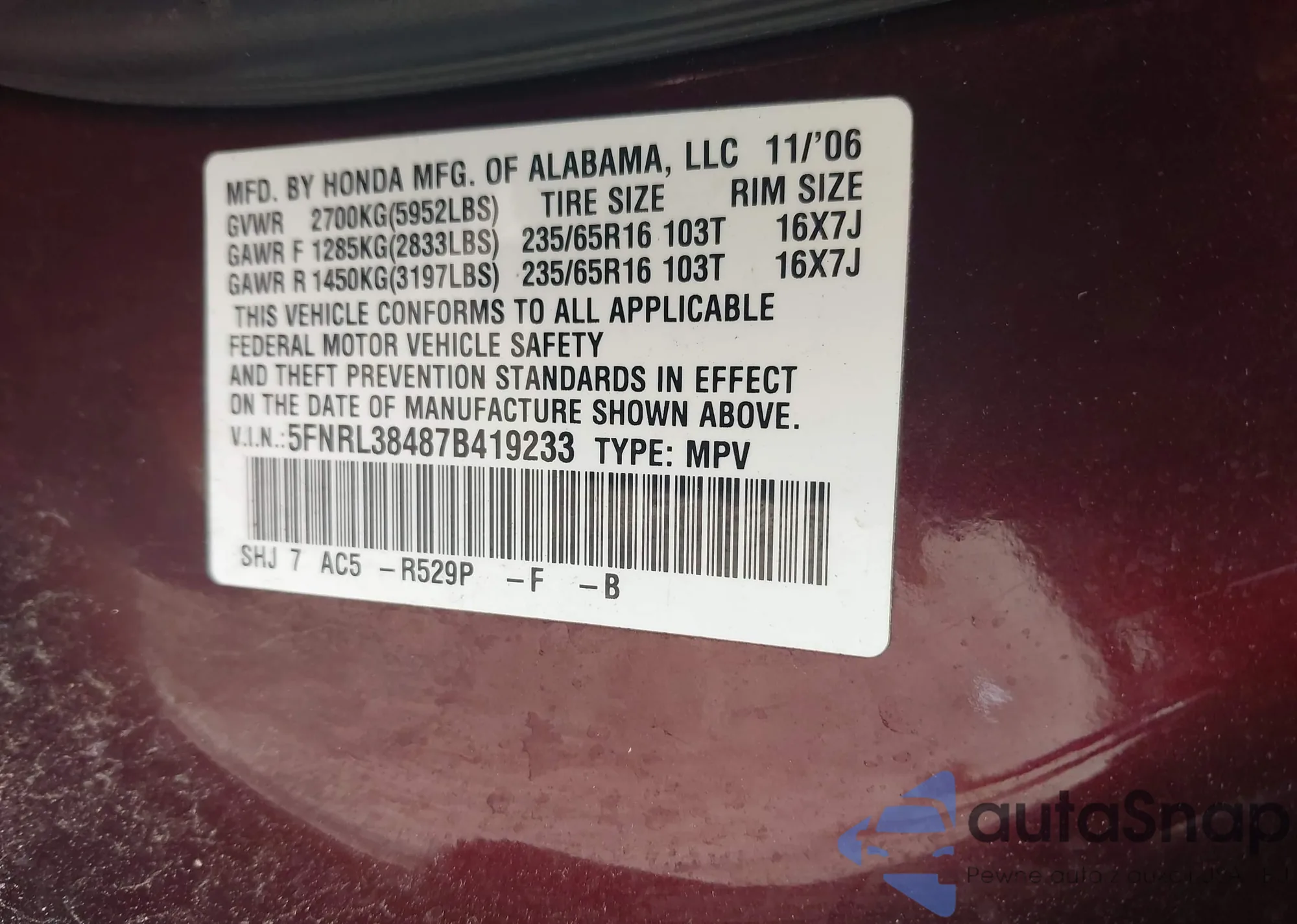 • VIN 5FNRL38487B419233