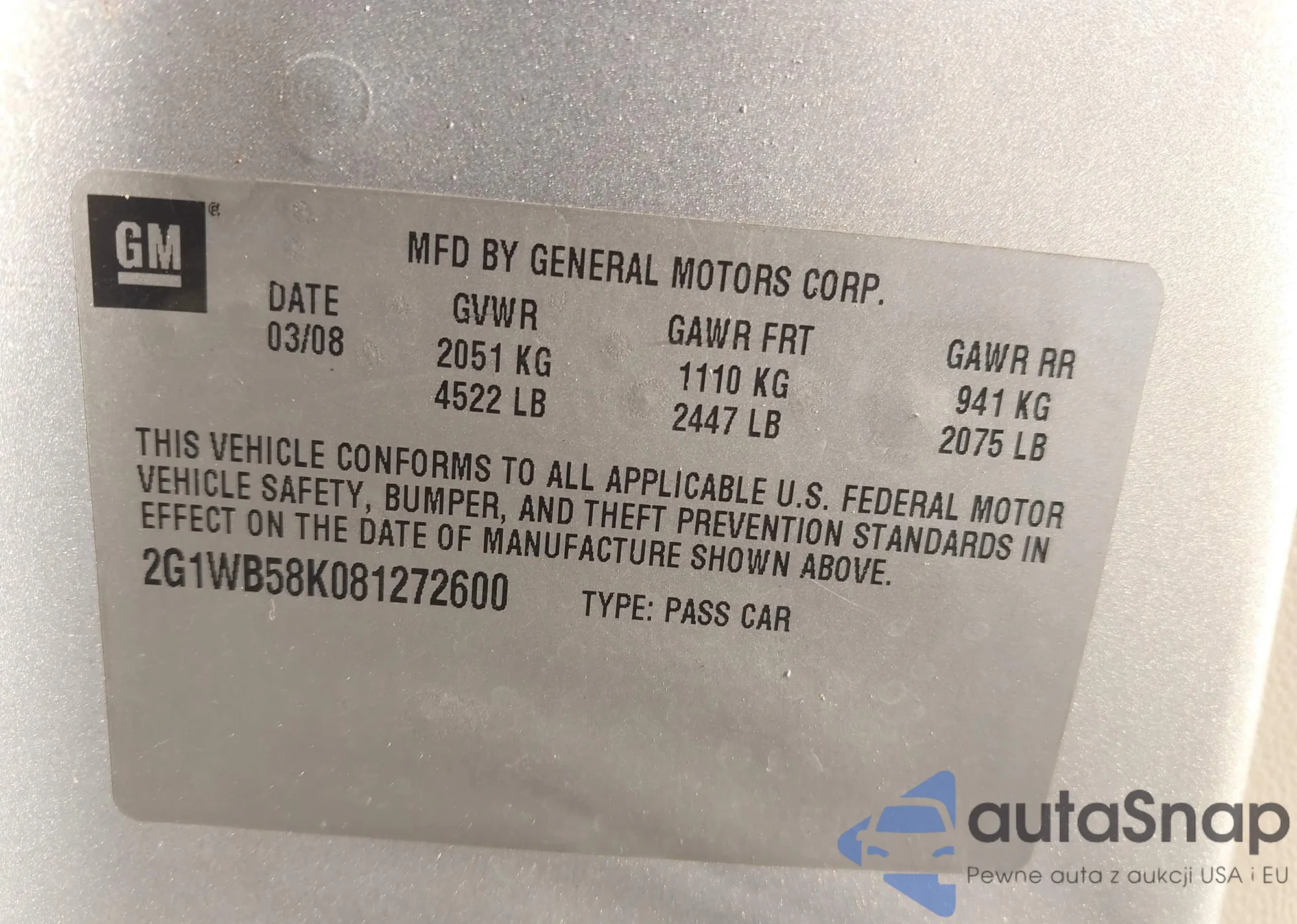 LOT: 42632538 VIN: 2G1WB58K081272600