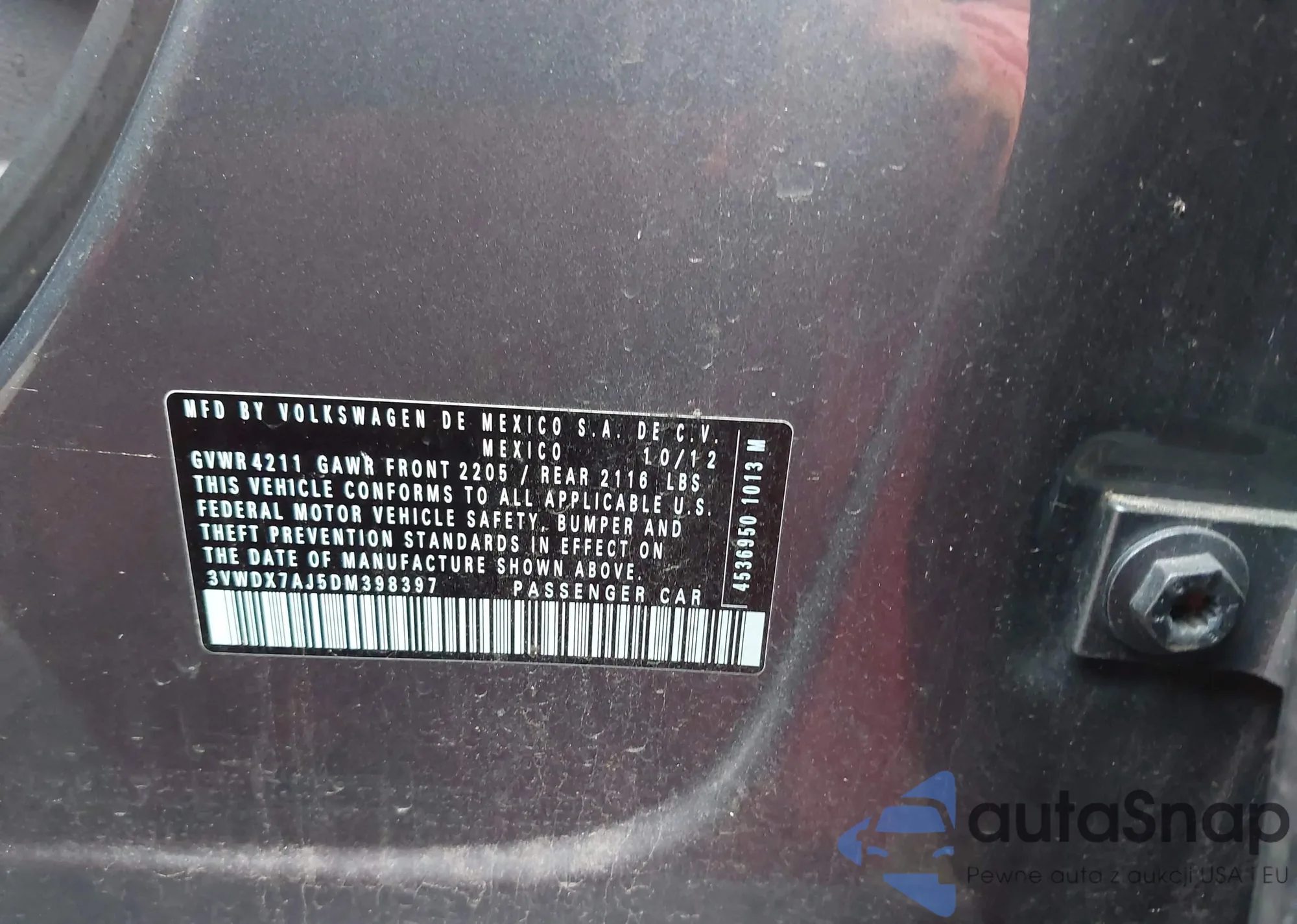 • VIN 3VWDX7AJ5DM398397
