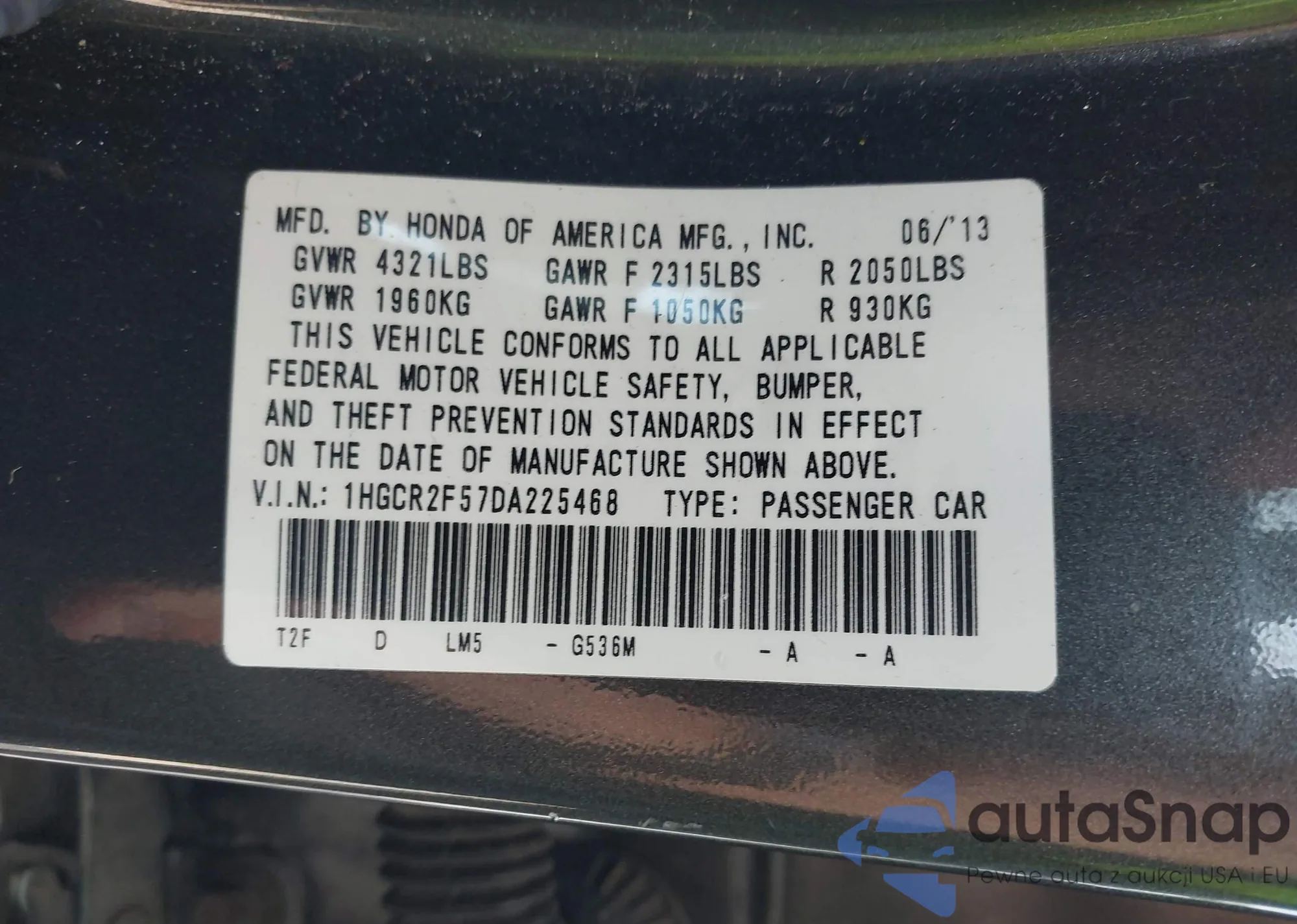 • VIN 1HGCR2F57DA225468