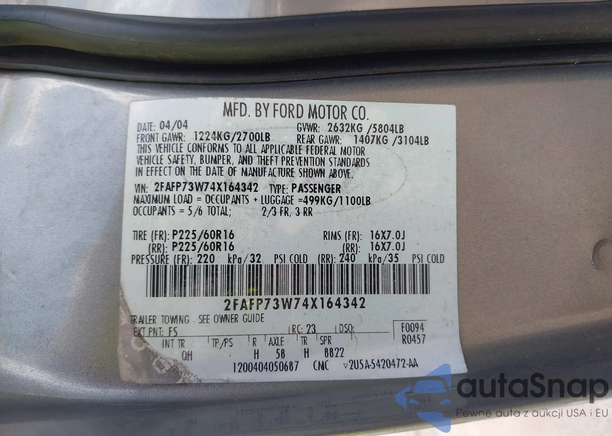 LOT: 42635226 VIN: 2FAFP73W74X164342