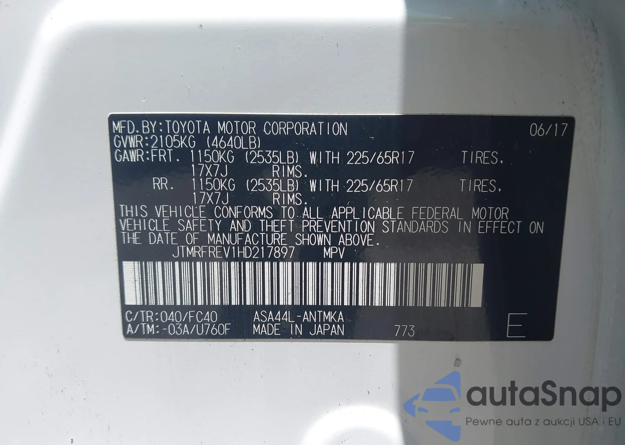 LOT: 42369374 VIN: JTMRFREV1HD217897
