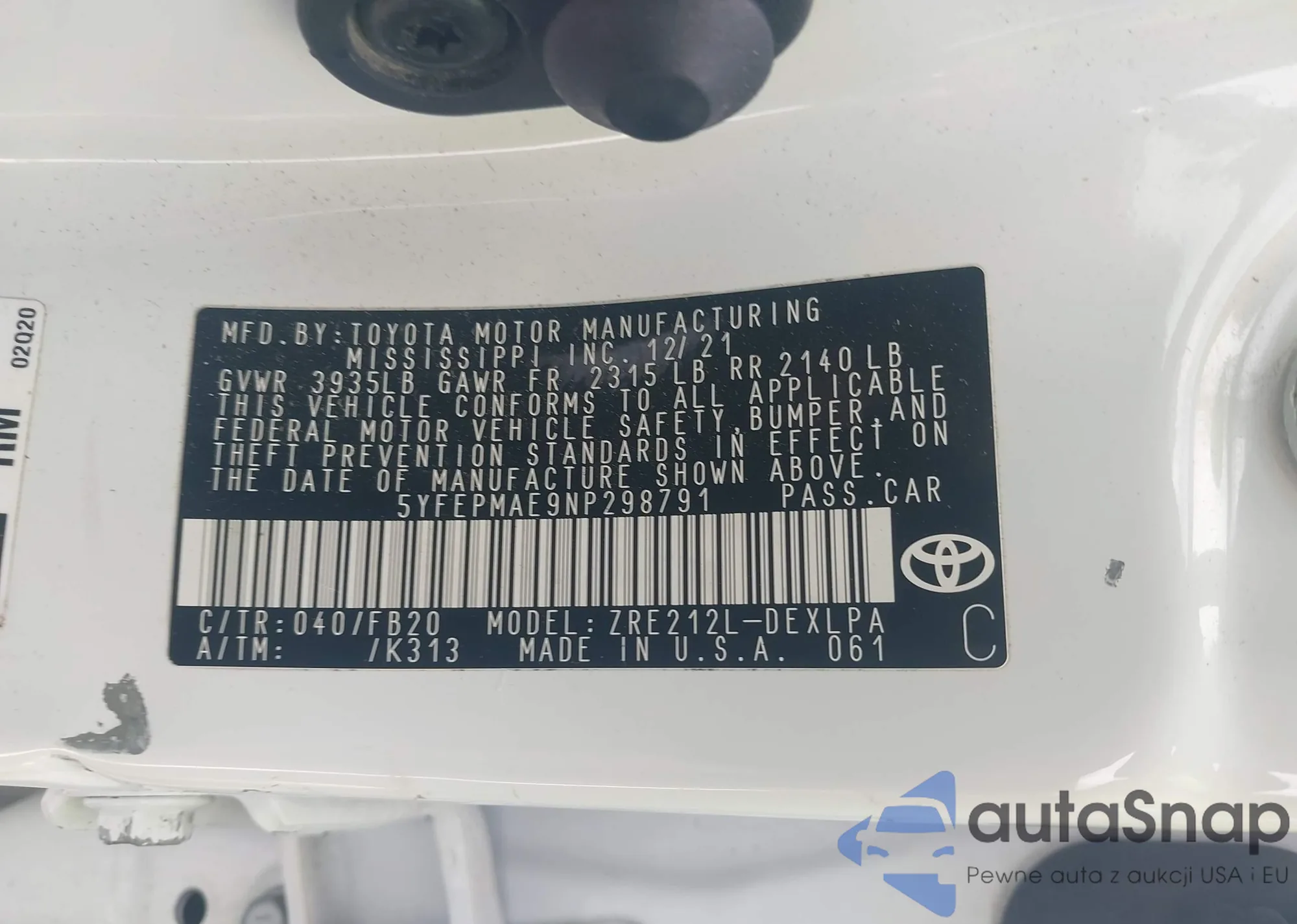 LOT: 42358661 VIN: 5YFEPMAE9NP298791