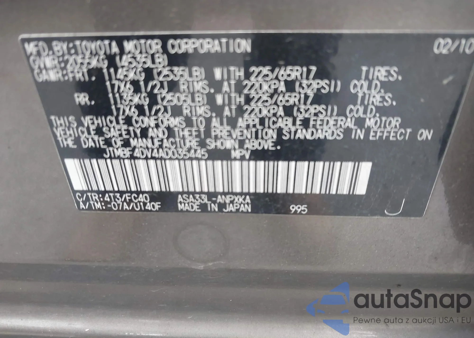 LOT: 42381811 VIN: JTMBF4DV4AD035445