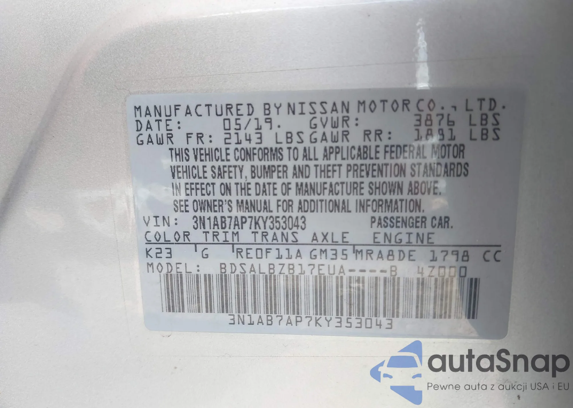 • VIN 3N1AB7AP7KY353043
