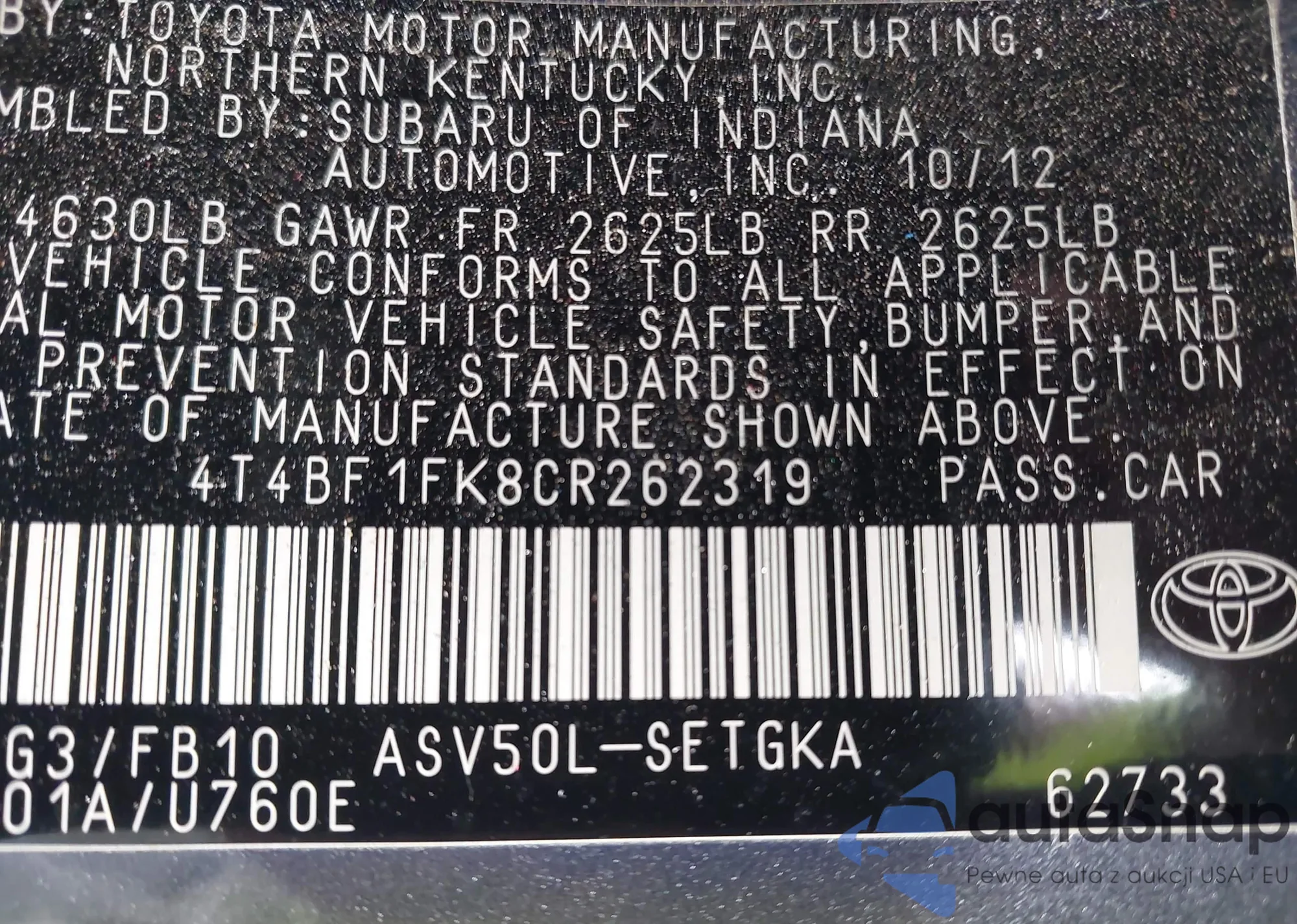 • VIN 4T4BF1FK8CR262319