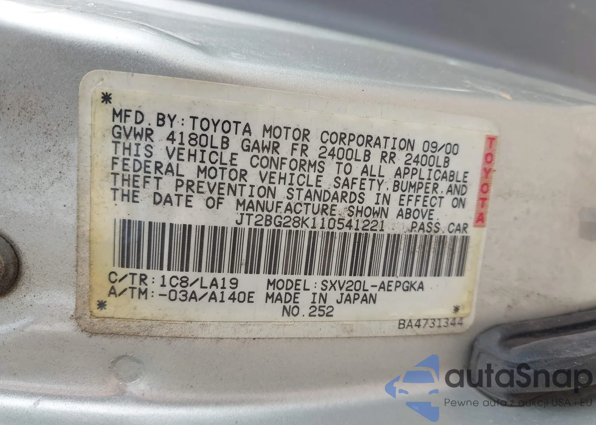 LOT: 42385283 VIN: JT2BG28K110541221