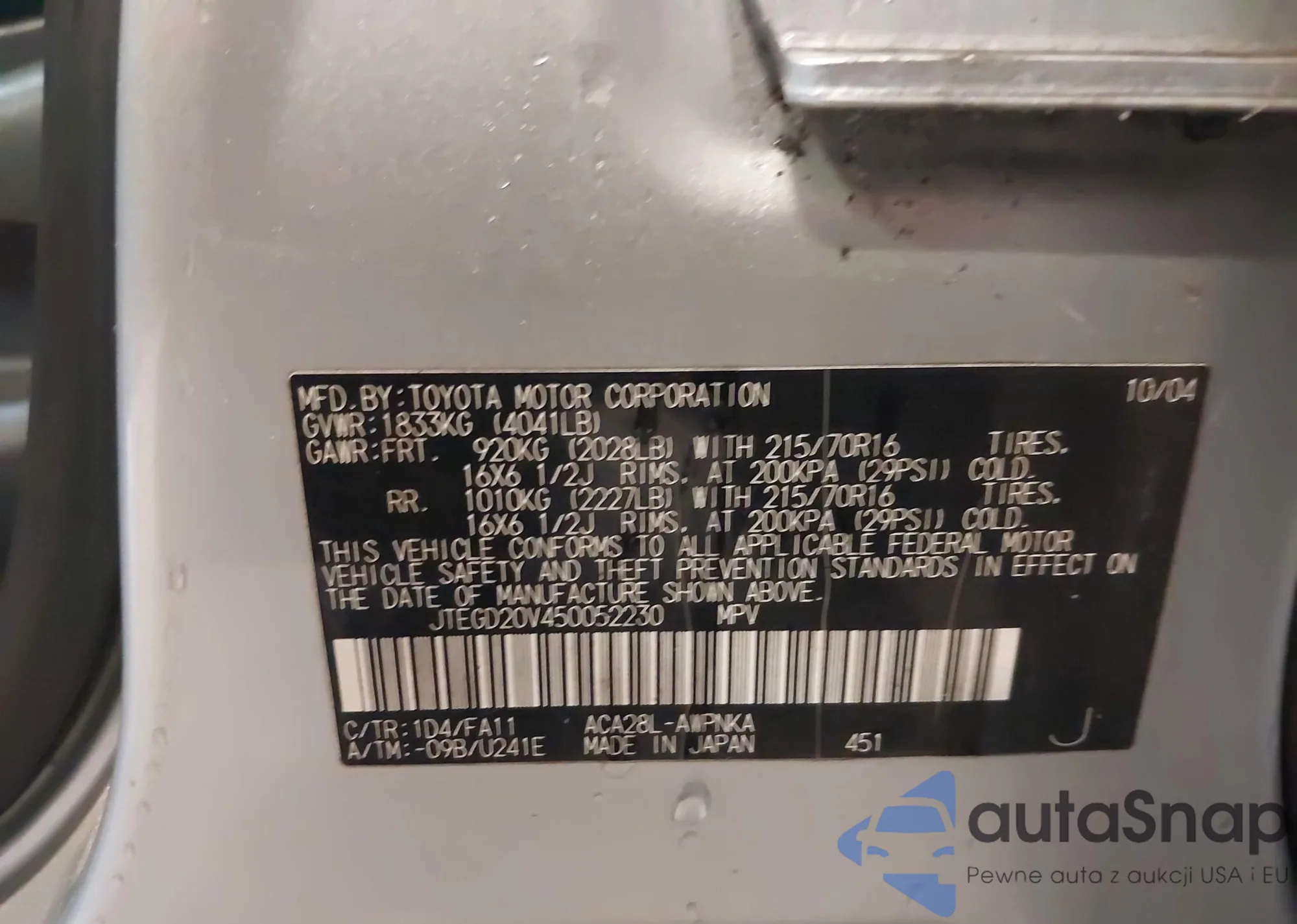 LOT: 42667810 VIN: JTEGD20V450052230