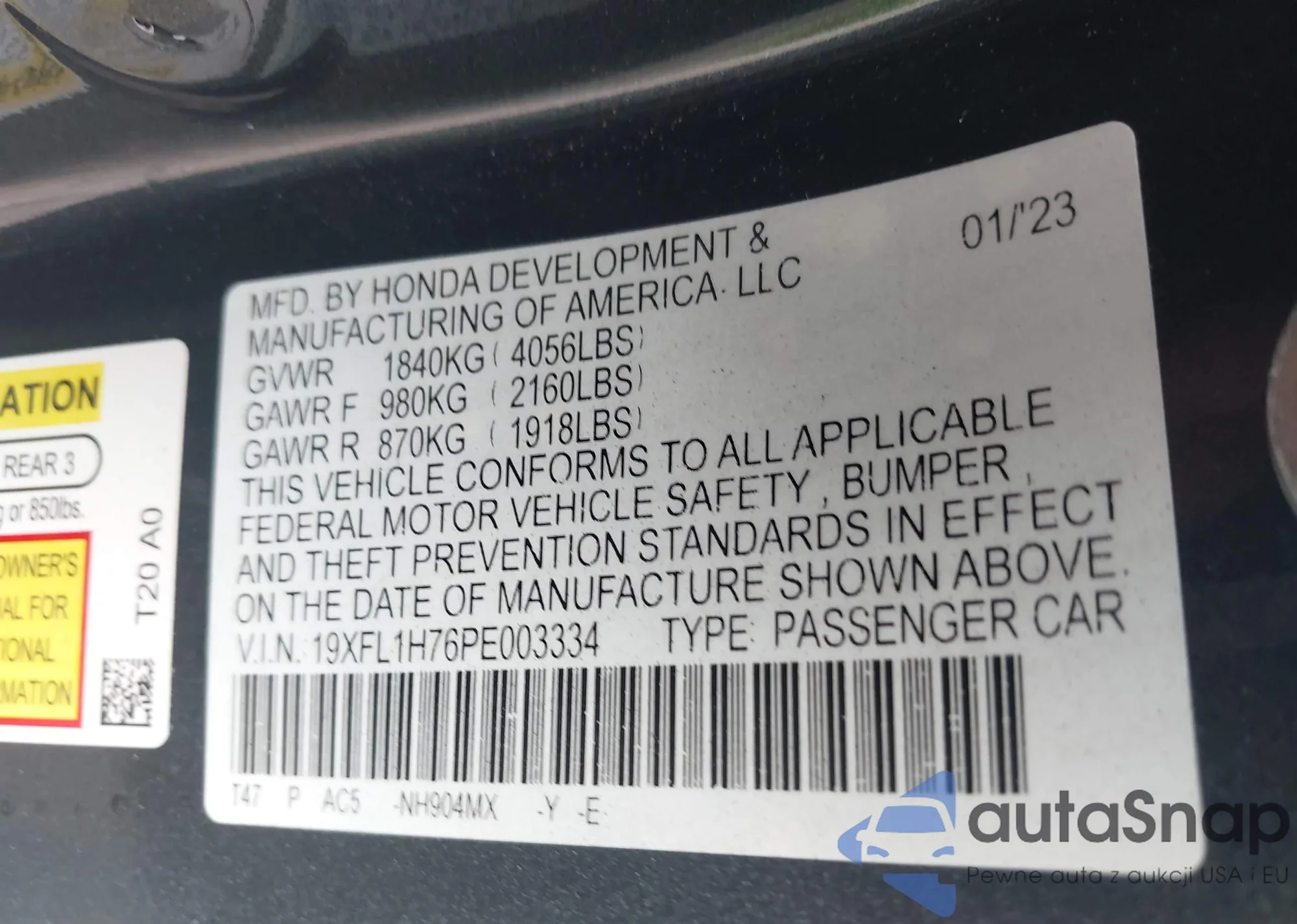 • VIN 19XFL1H76PE003334