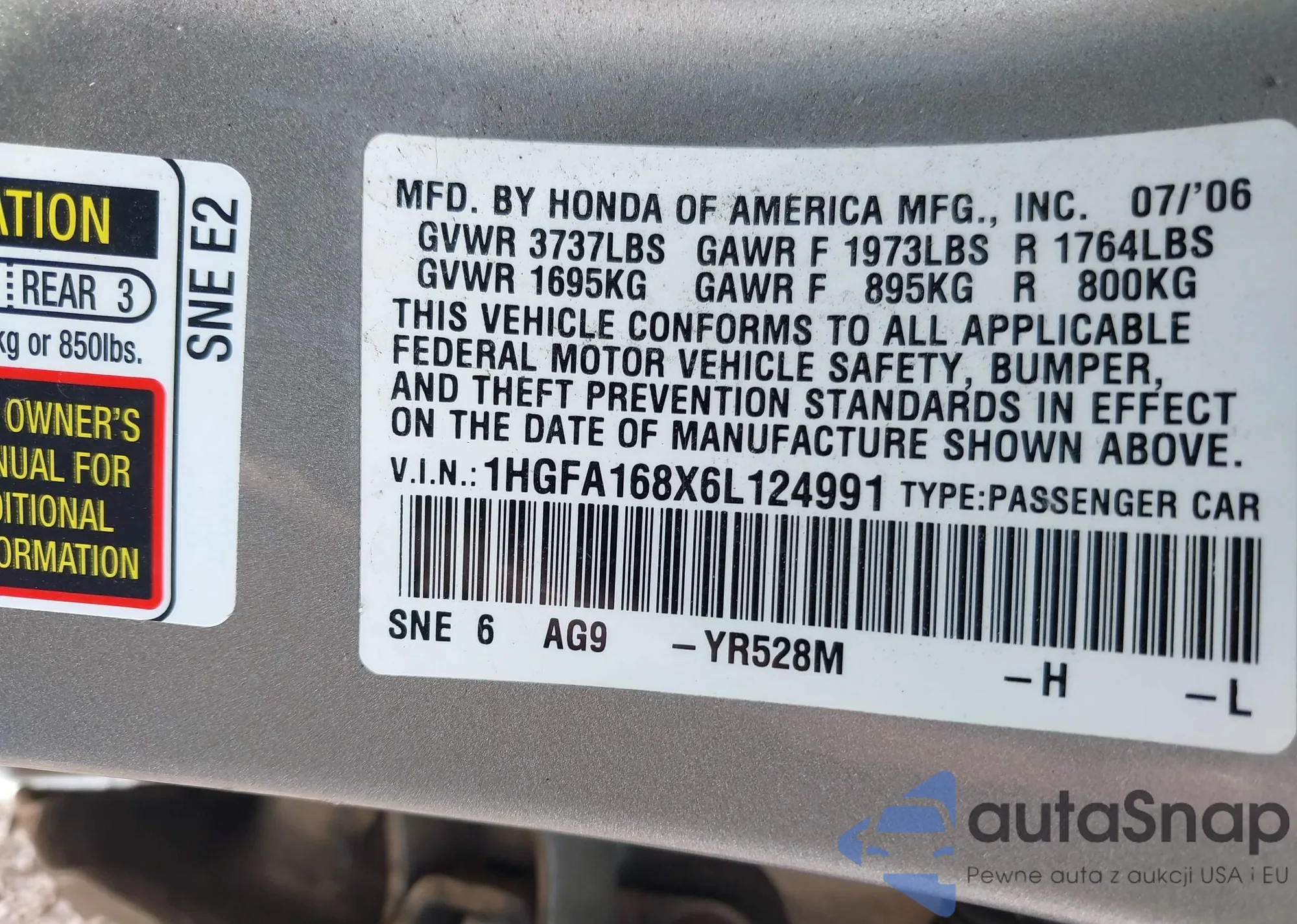 LOT: 42452200 VIN: 1HGFA168X6L124991