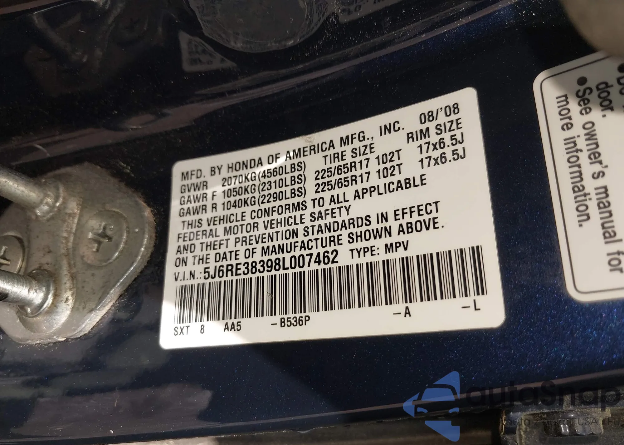 • VIN 5J6RE38398L007462