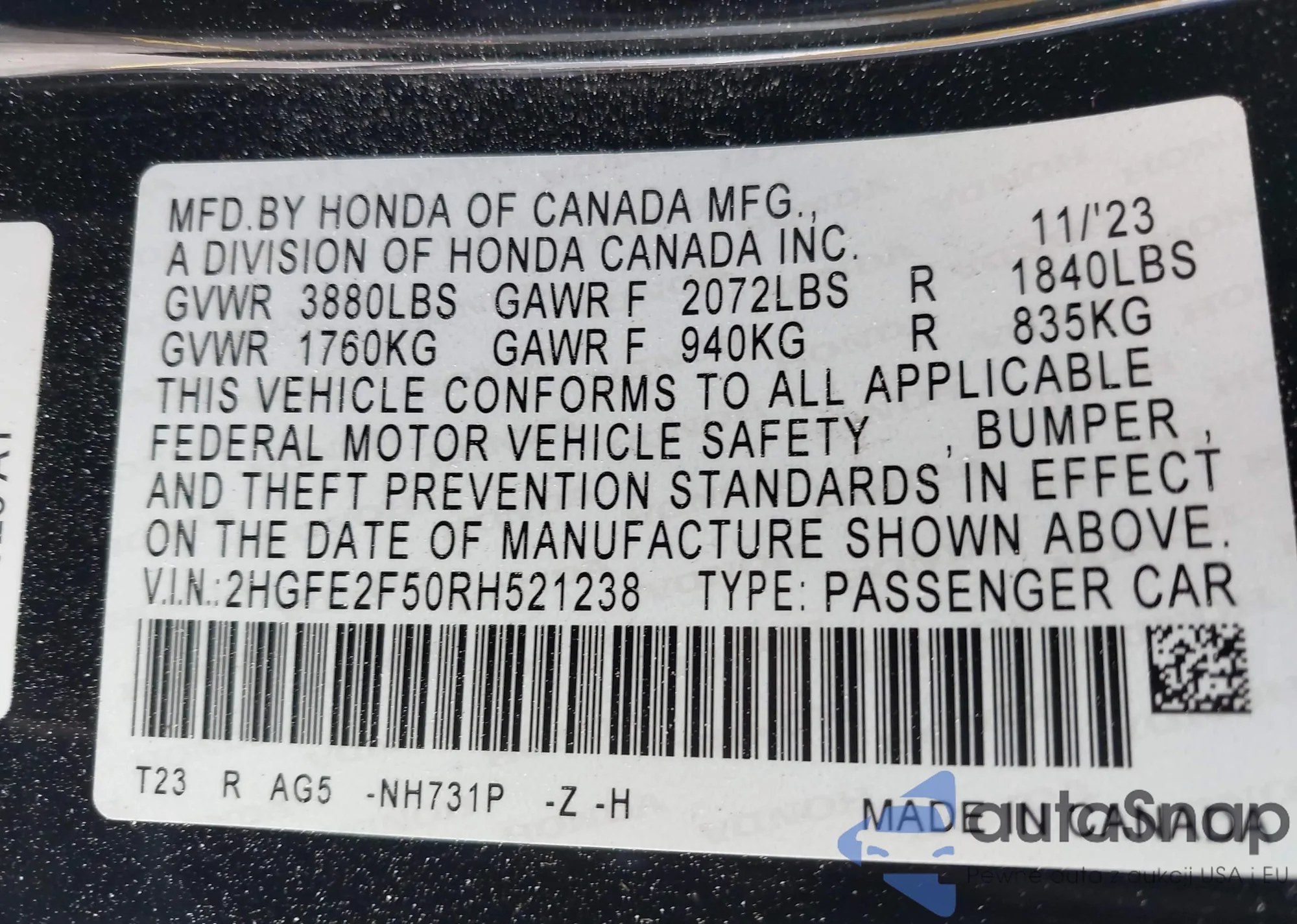 LOT: 42314346 VIN: 2HGFE2F50RH521238