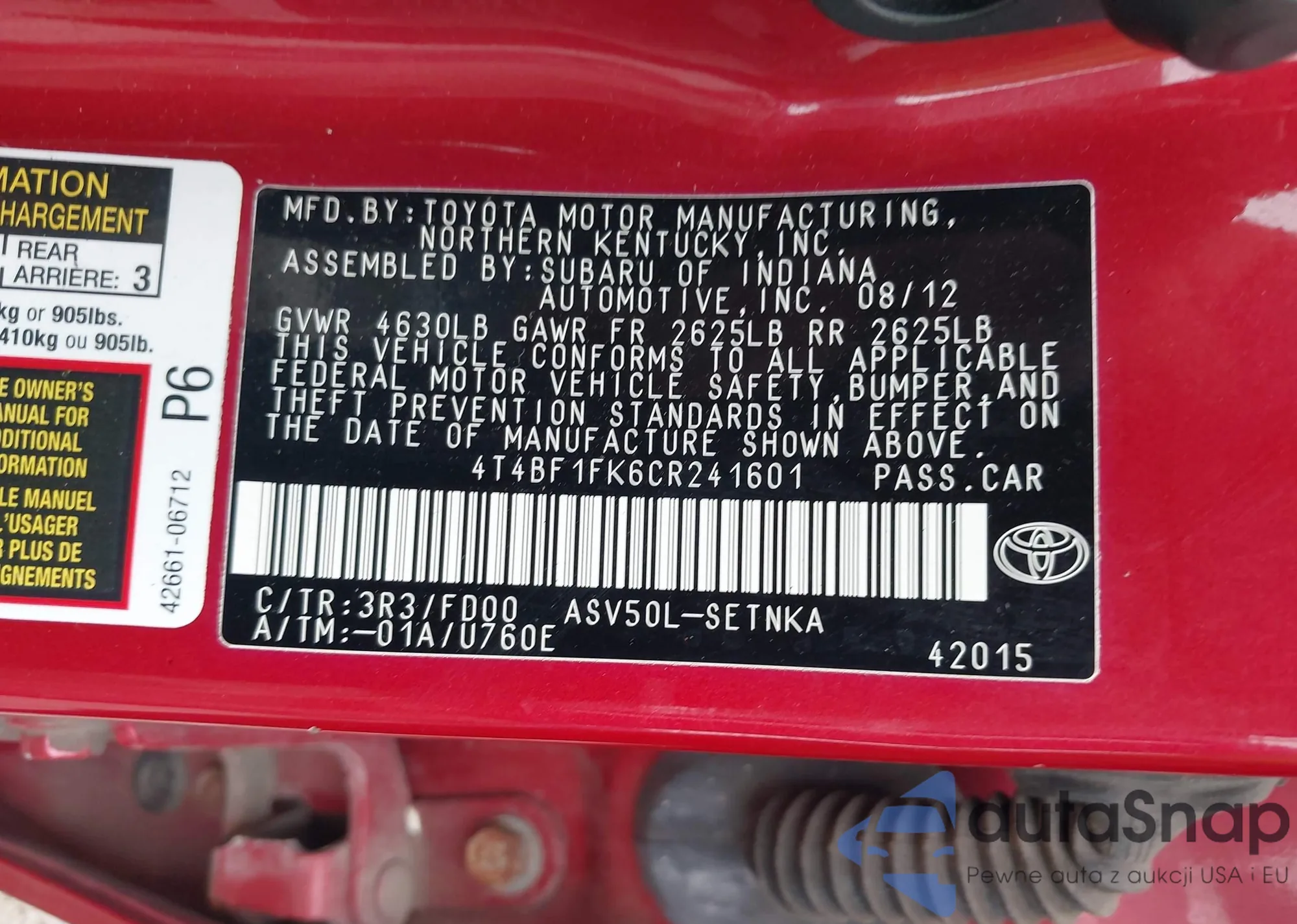 • VIN 4T4BF1FK6CR241601