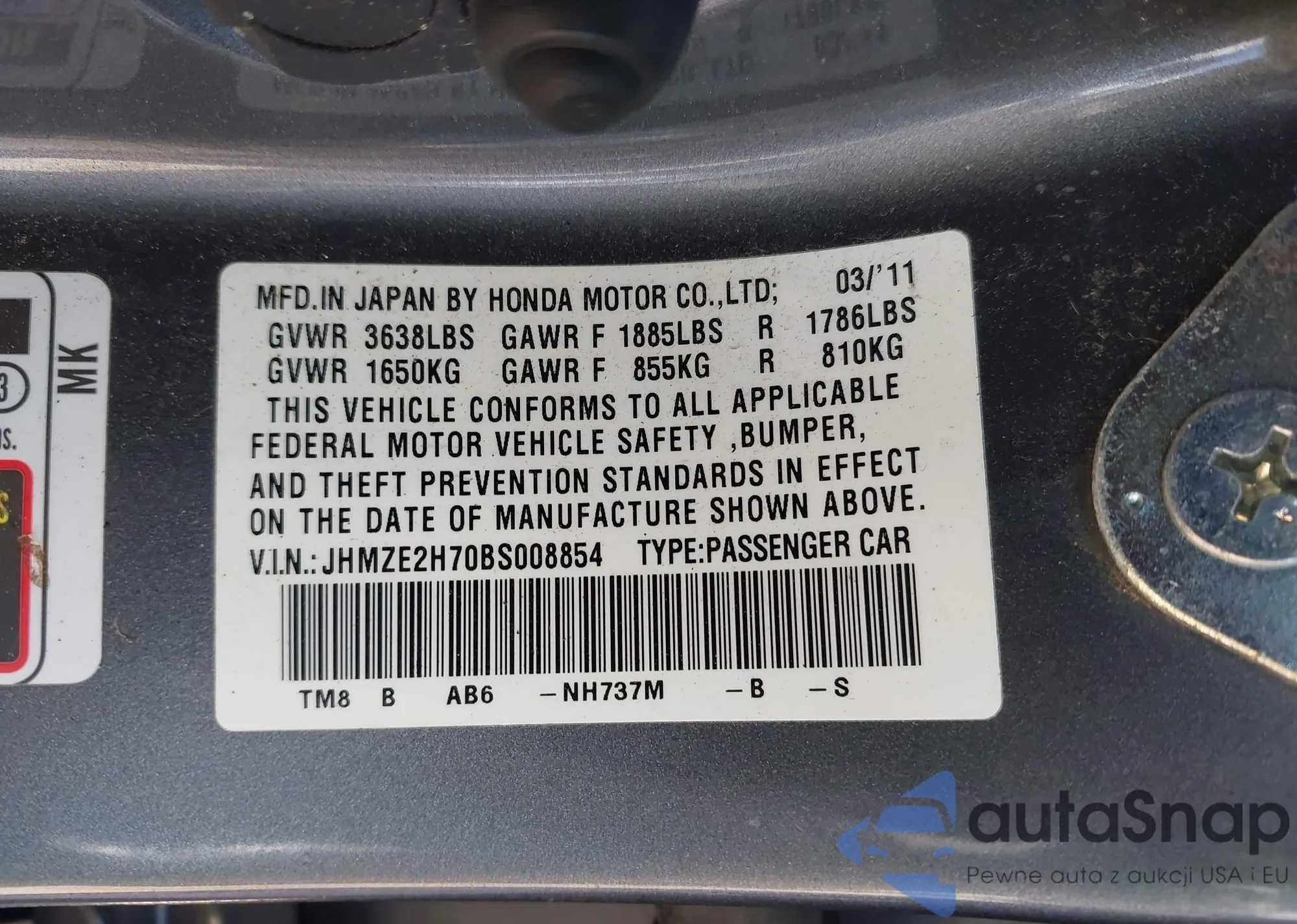 LOT: 42612067 VIN: JHMZE2H70BS008854