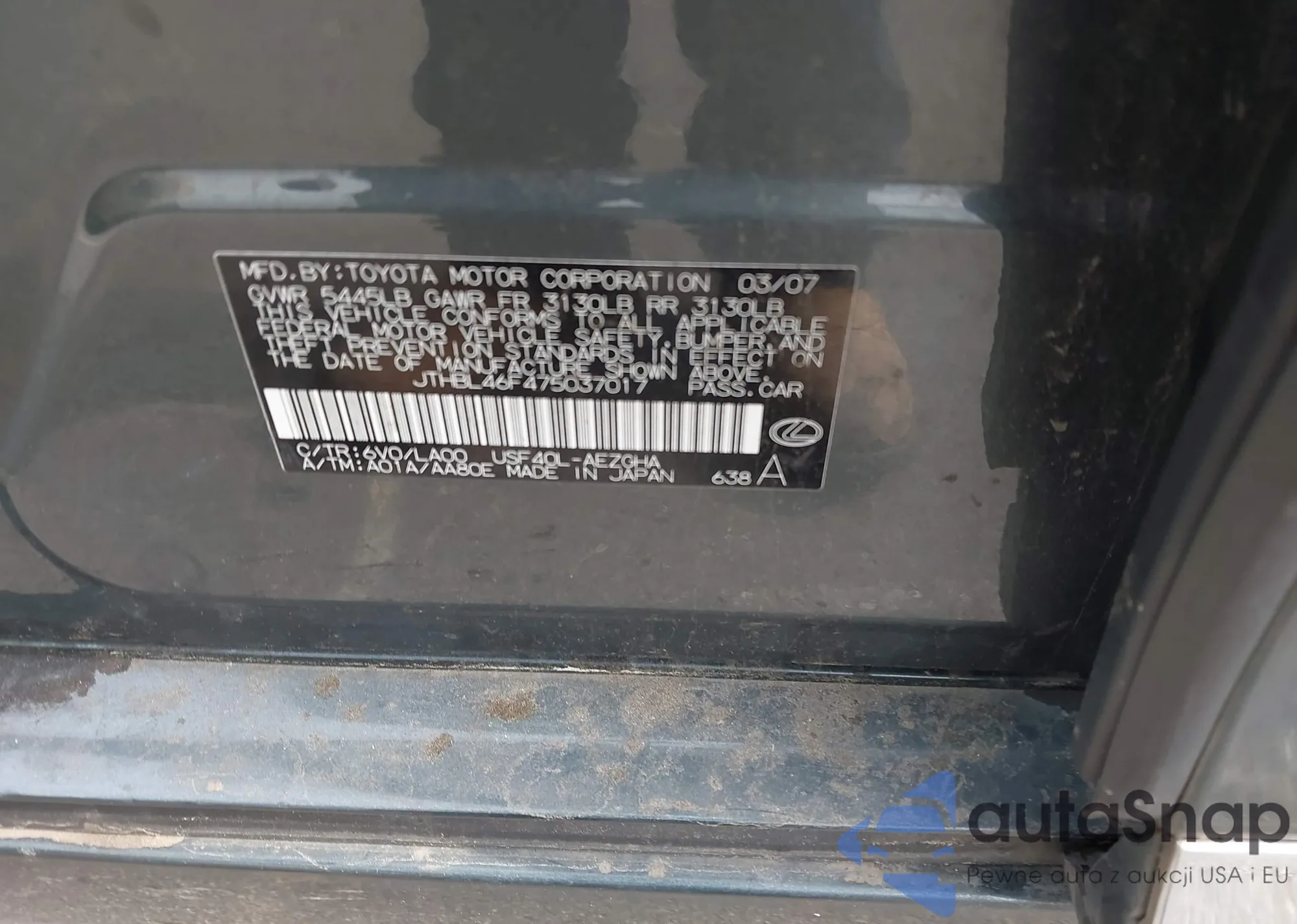 LOT: 42291980 VIN: JTHBL46F475037017