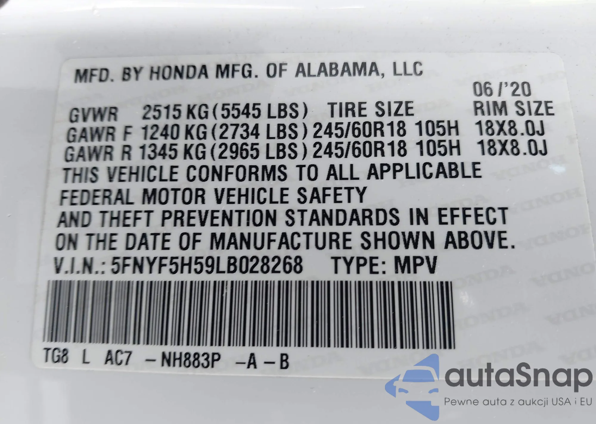 • VIN 5FNYF3H51EB008989
