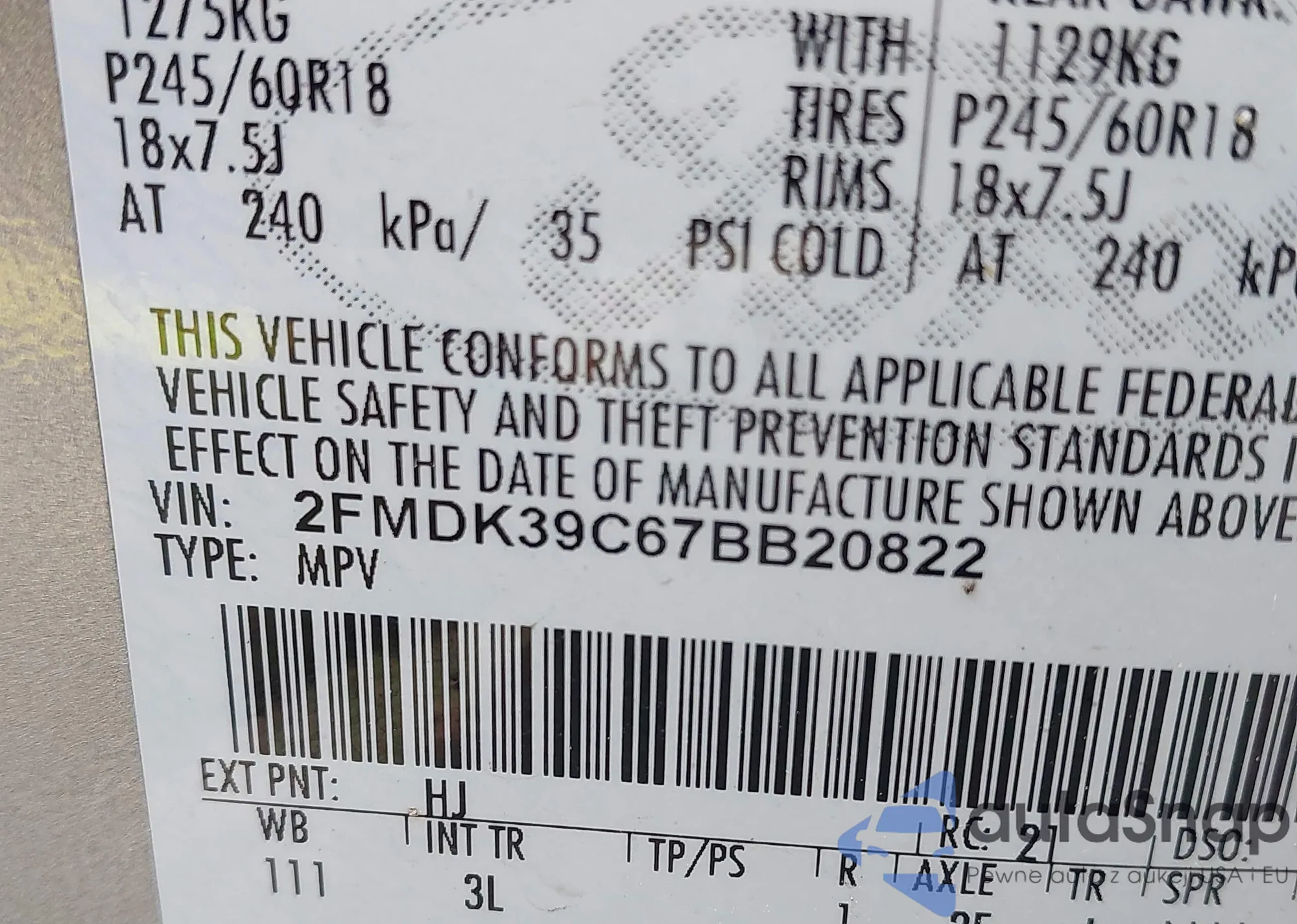 • VIN 2FMDK39C67BB20822