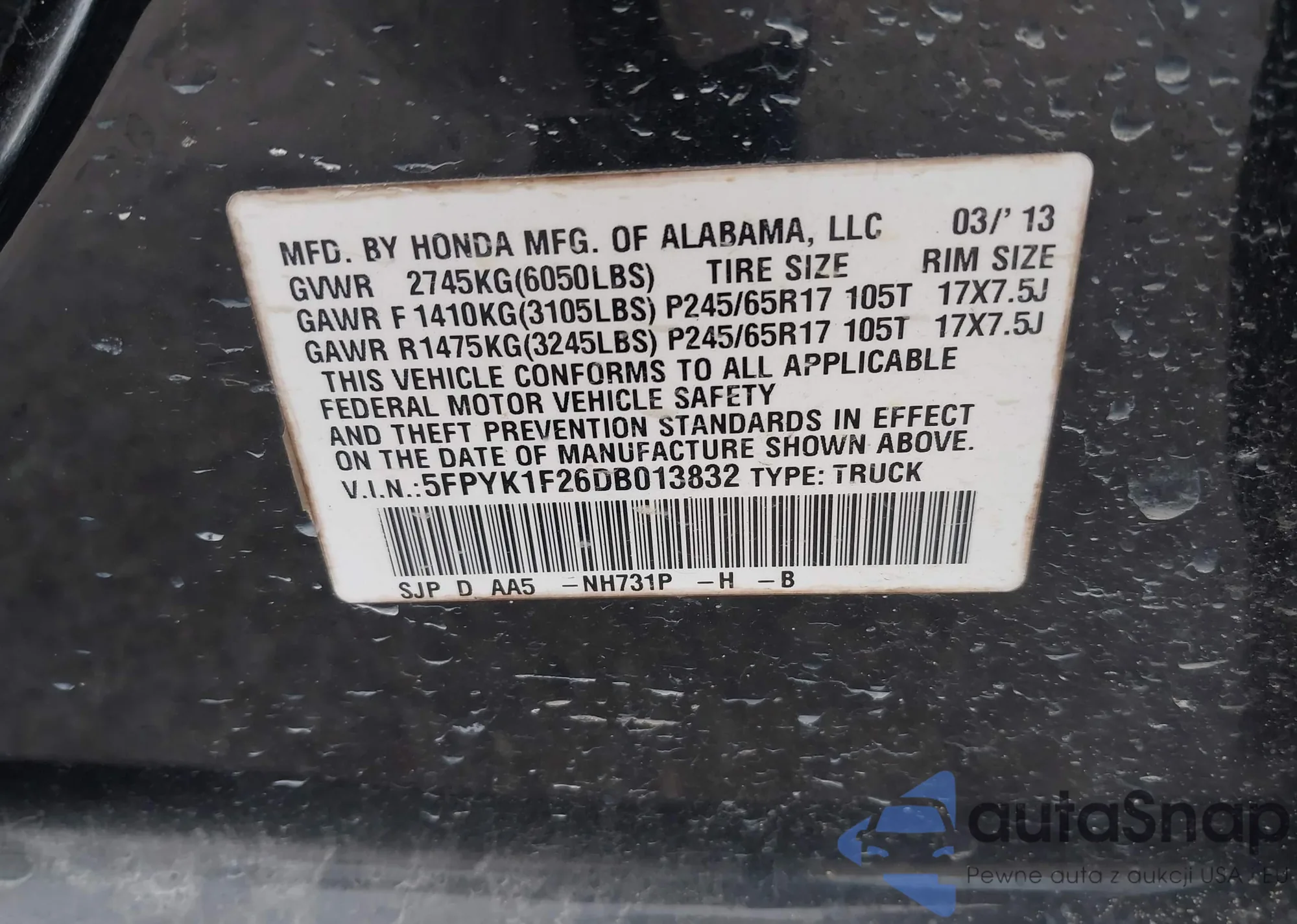 • VIN 5FPYK1F26DB013832