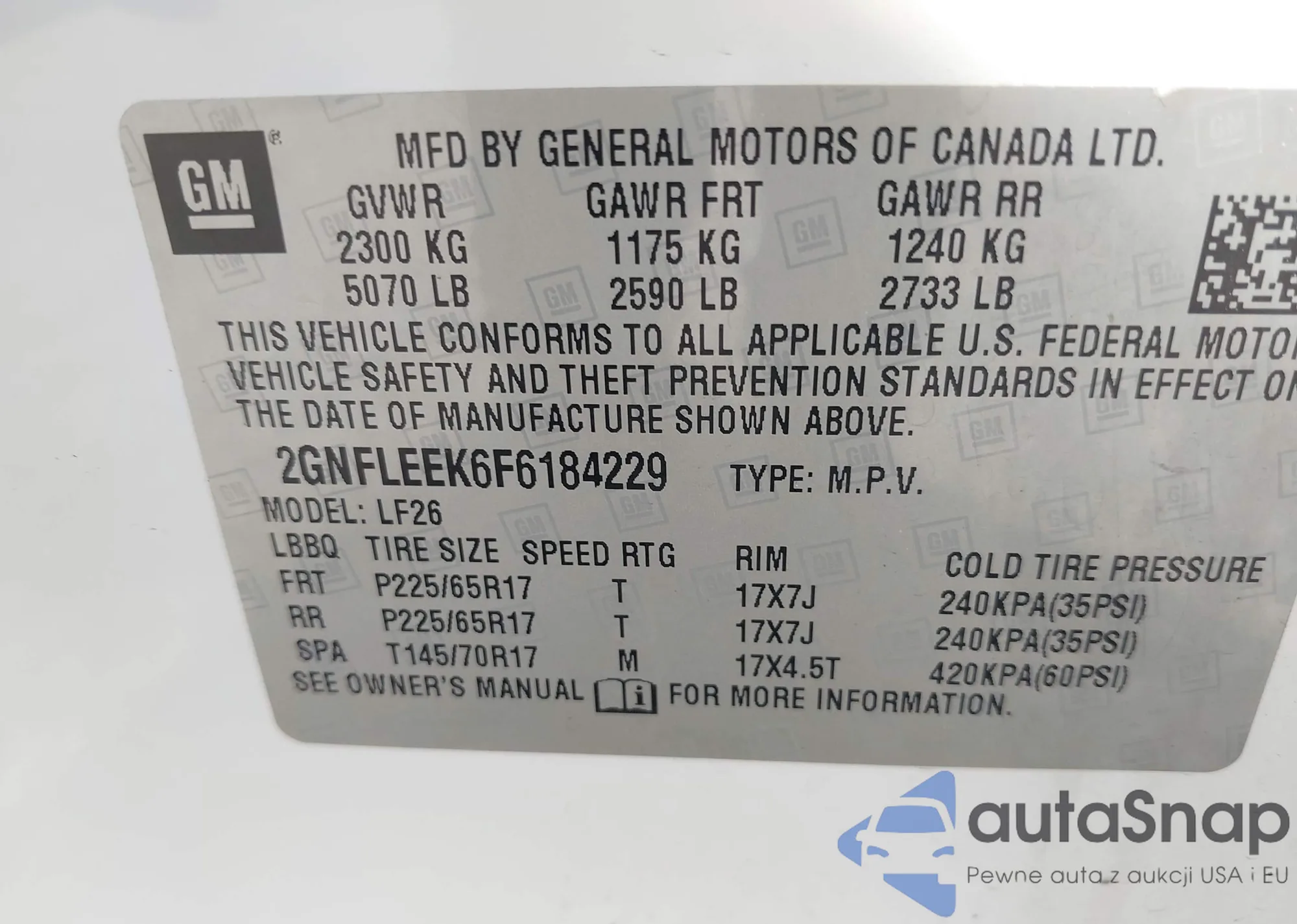 LOT: 42244612 VIN: KNAFE121265340380