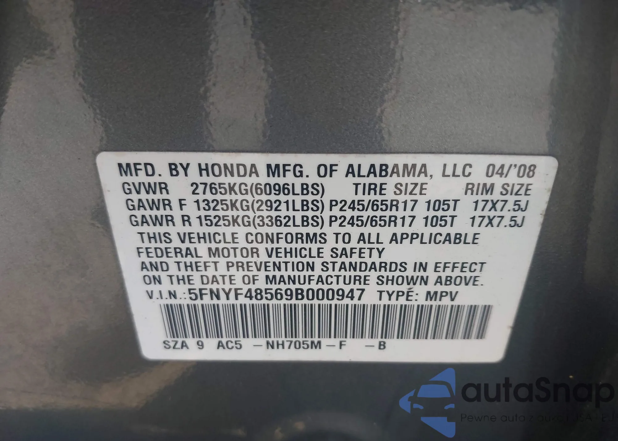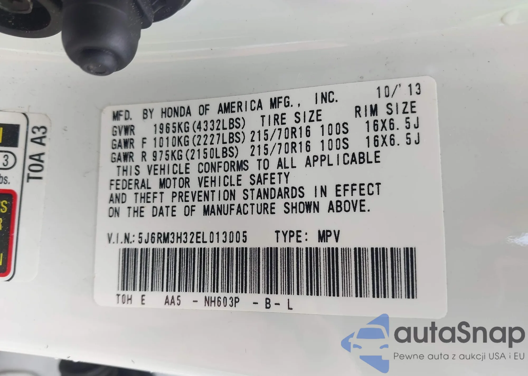 • VIN 5J6RM3H32EL013005
