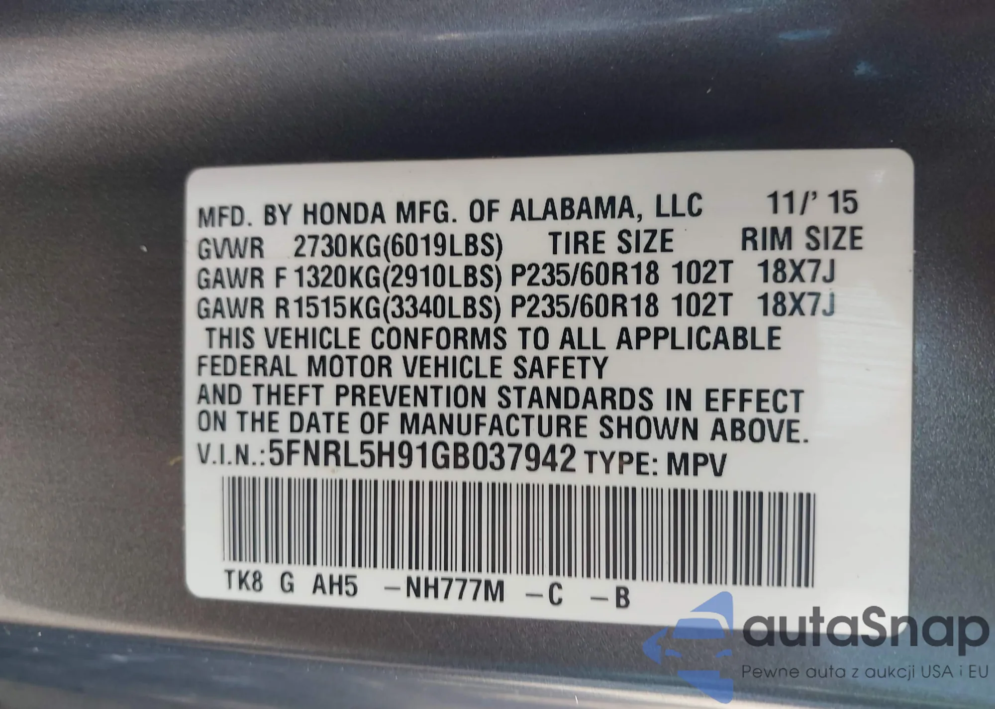 LOT: 42413215 VIN: 5FNYF3H55BB039495