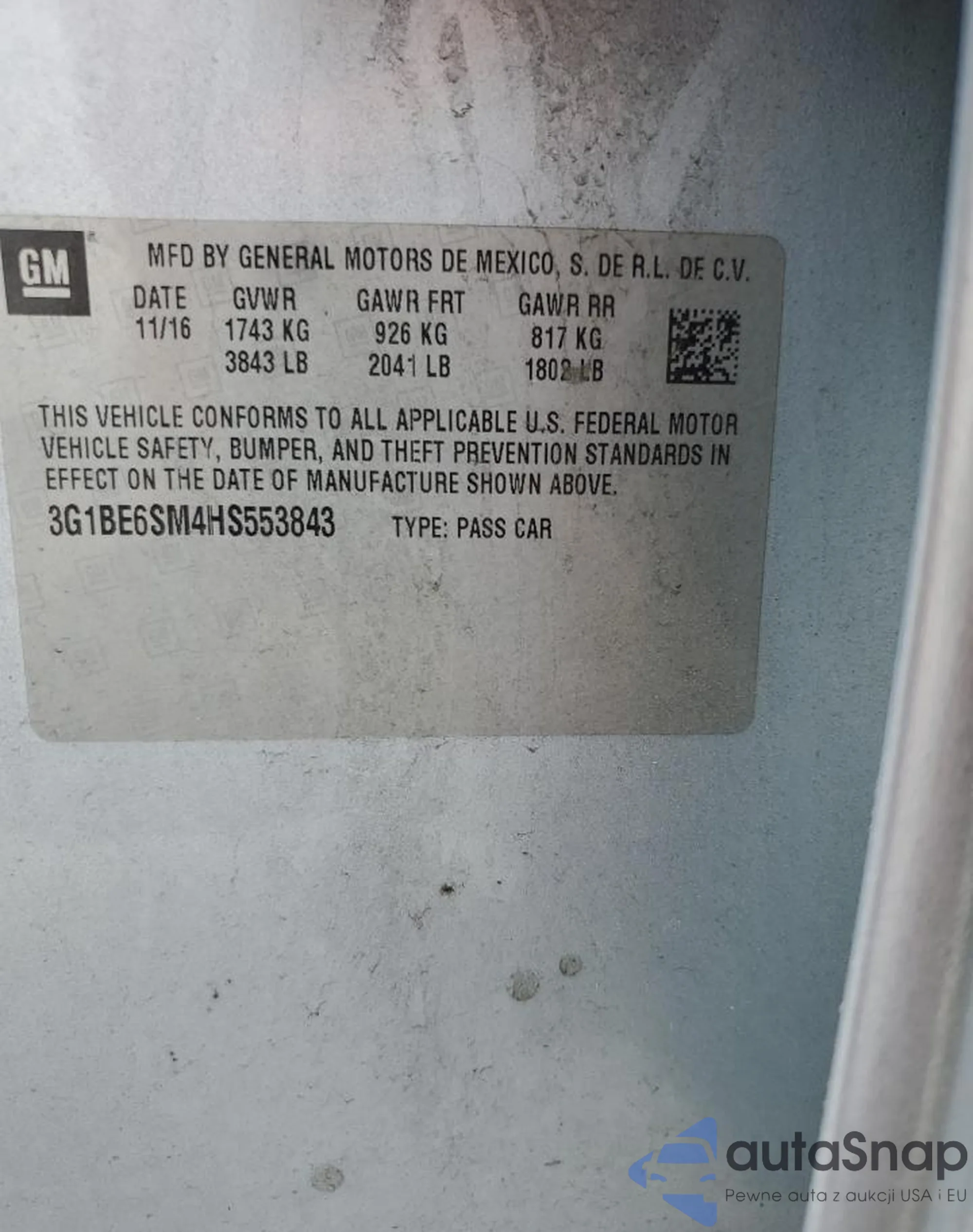 LOT: 58730115 VIN: 3G1BE6SM4HS553843