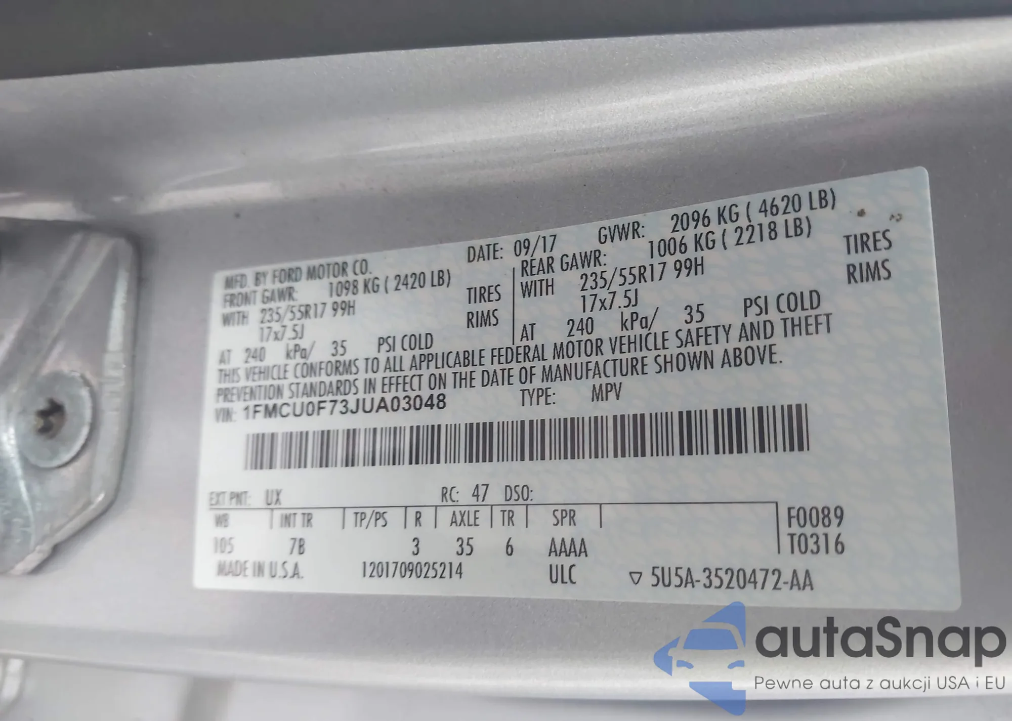 LOT: 42623978 VIN: 1FMCU0F73JUA03048