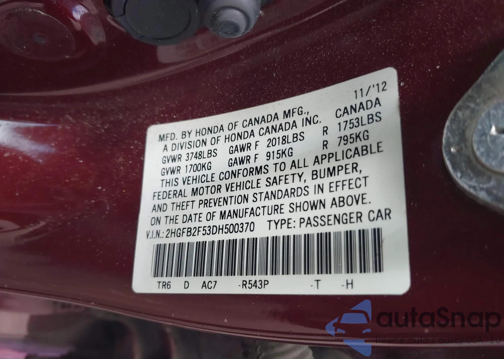 LOT: 42657019 VIN: 2HGFB2F53DH500370