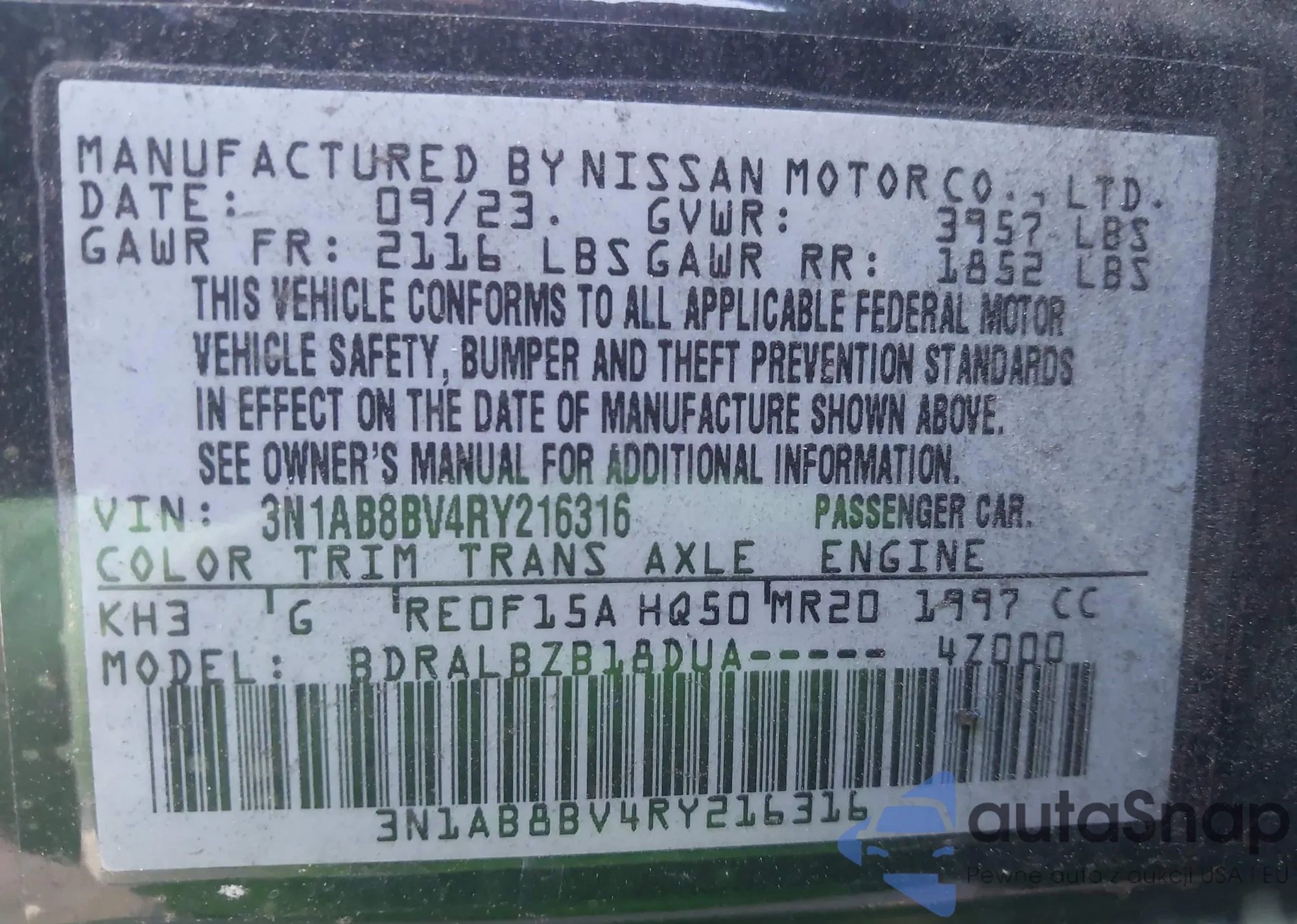 • VIN 3N1AB8BV4RY216316