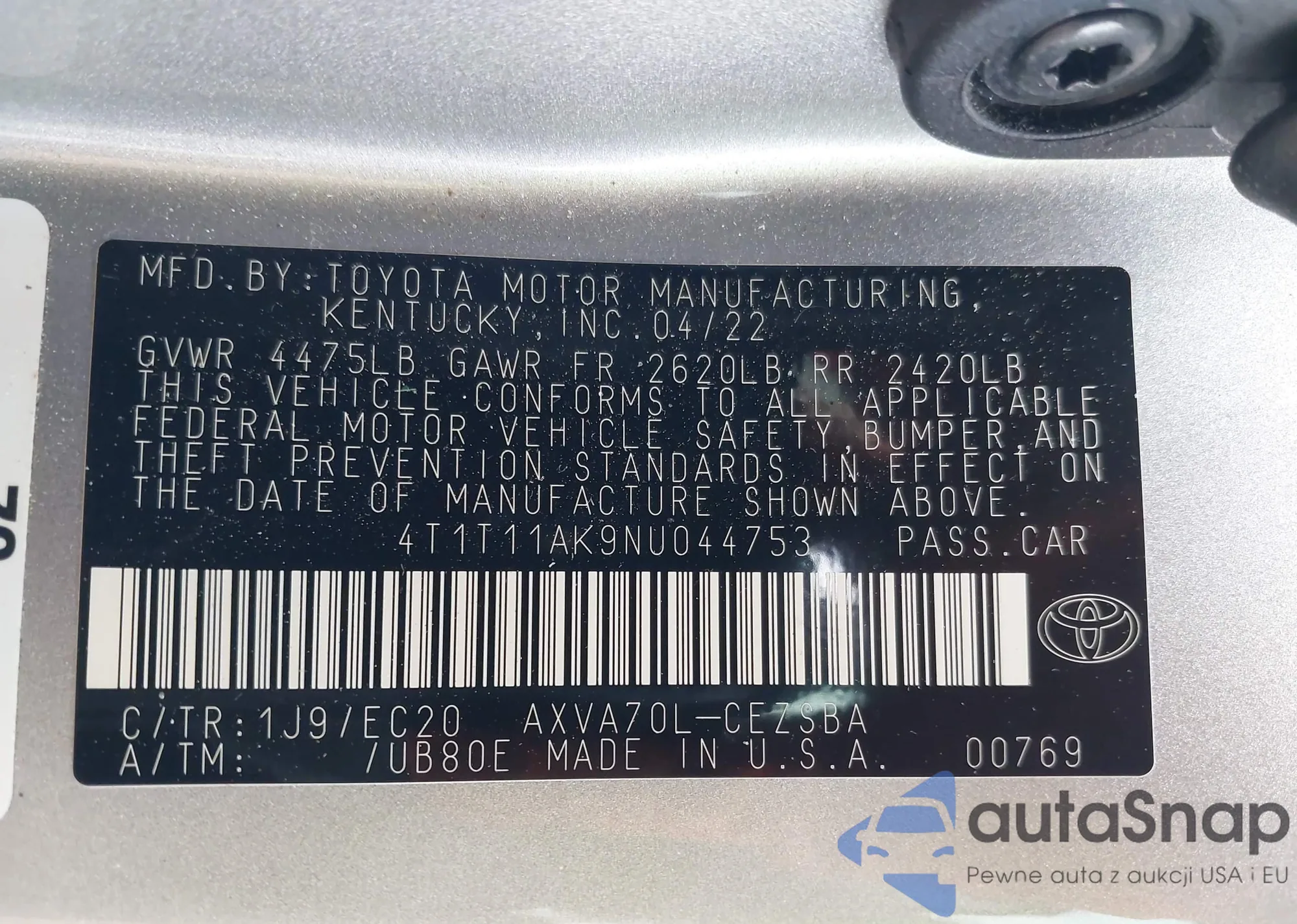 • VIN 4T1T11AK9NU044753