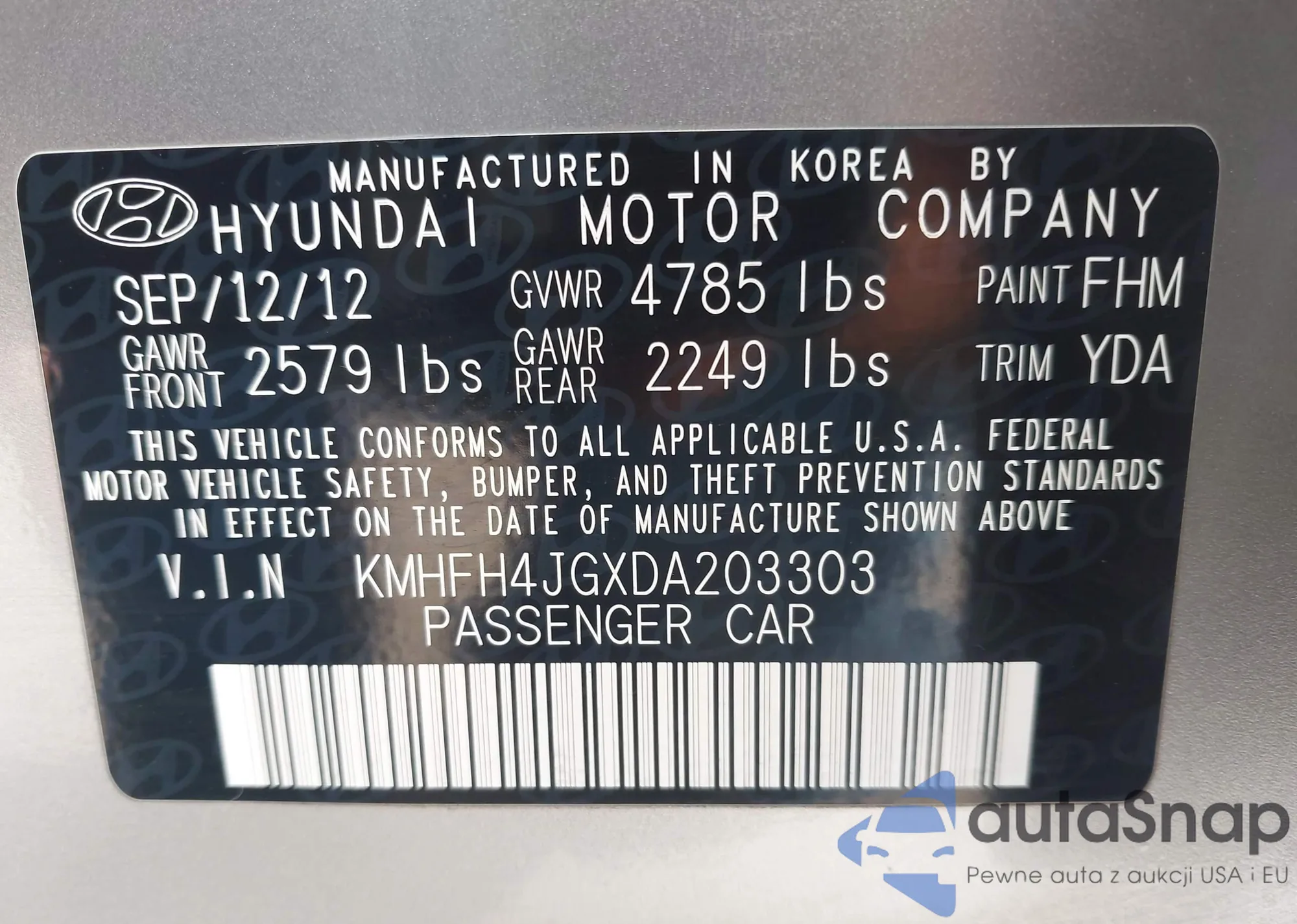 LOT: 42097589 VIN: KMHFH4JGXDA203303