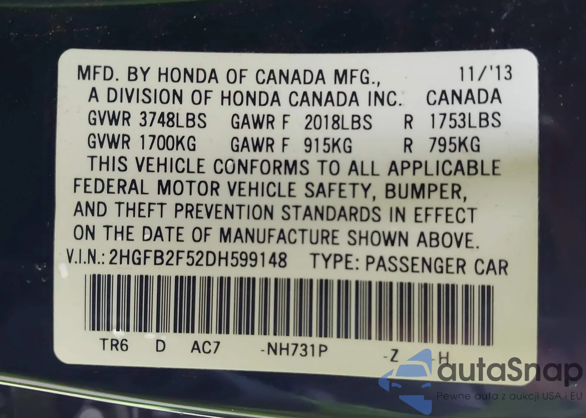 LOT: 42198790 VIN: 2HGFB2F52DH599148