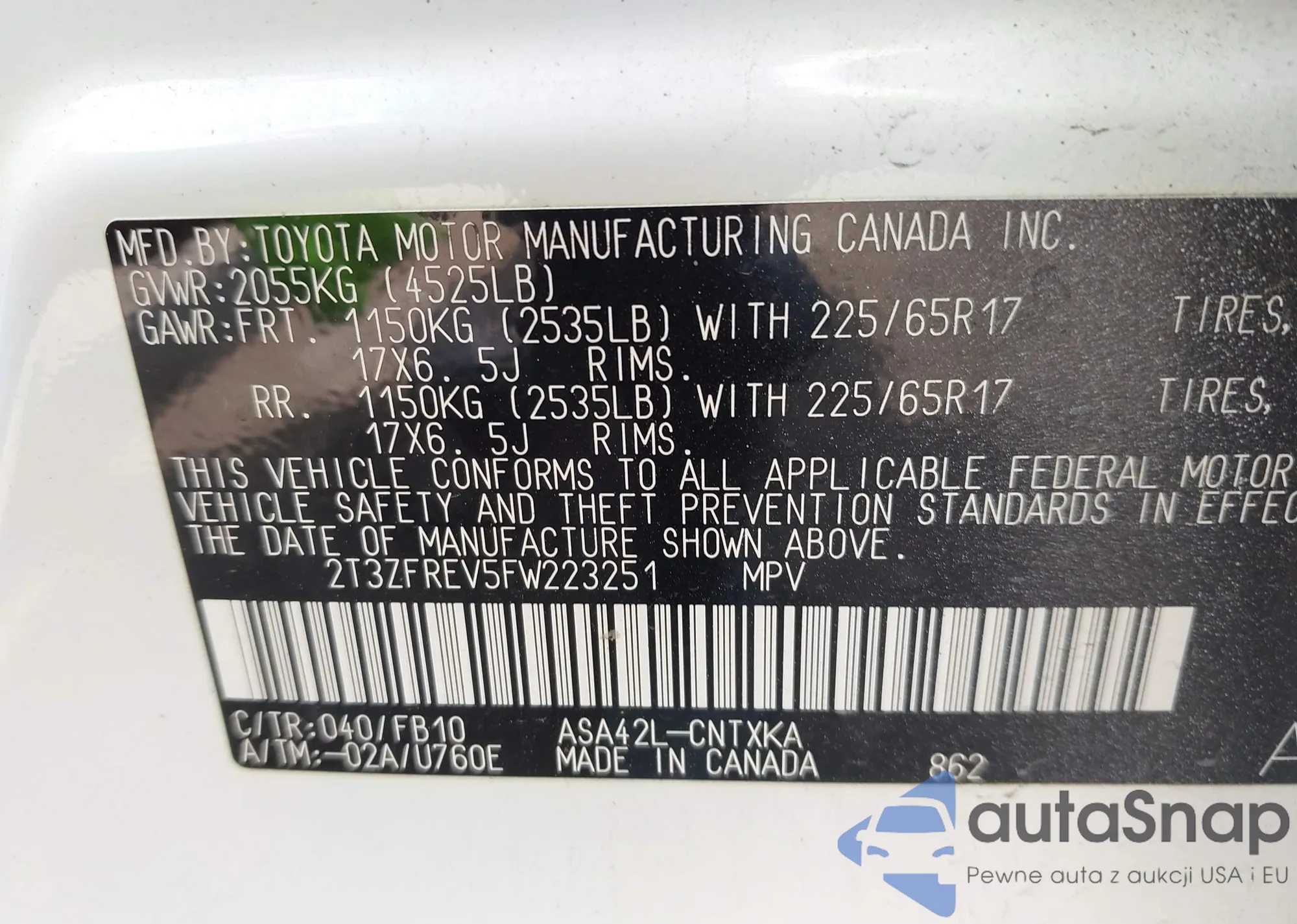 • VIN 2T3ZFREV5FW223251