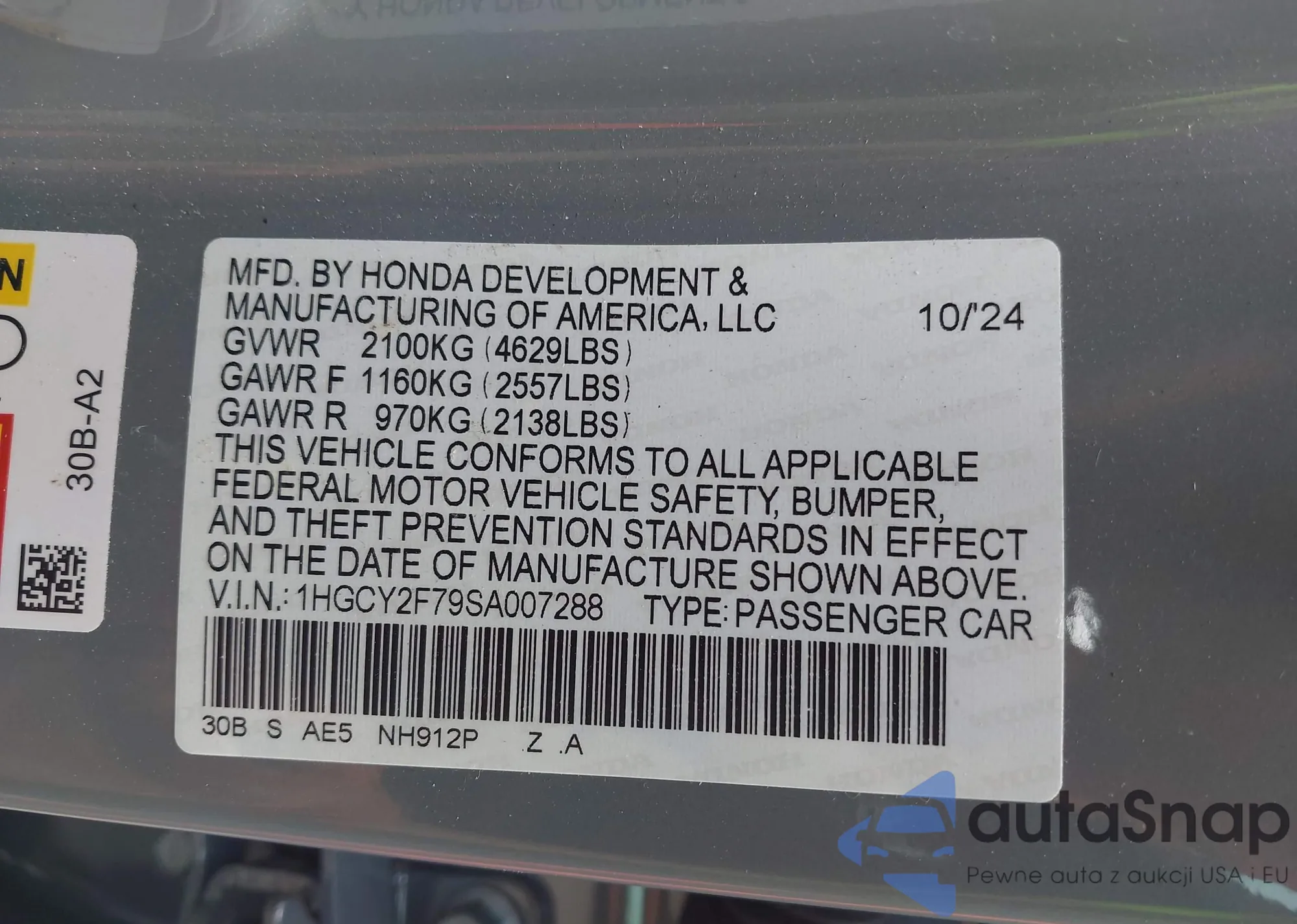 • VIN 1HGCY2F79SA007288