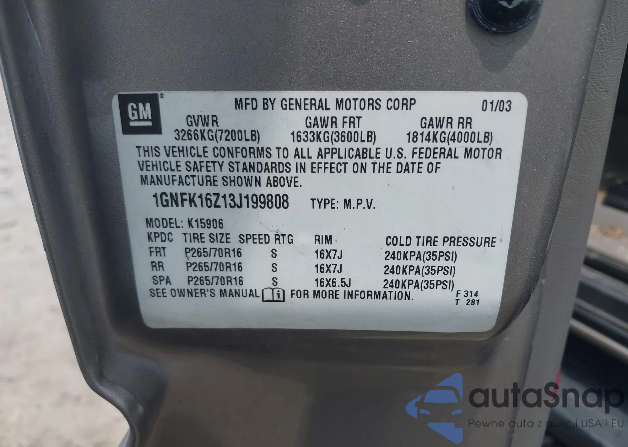LOT: 42404012 VIN: 1GNFK16Z13J19980