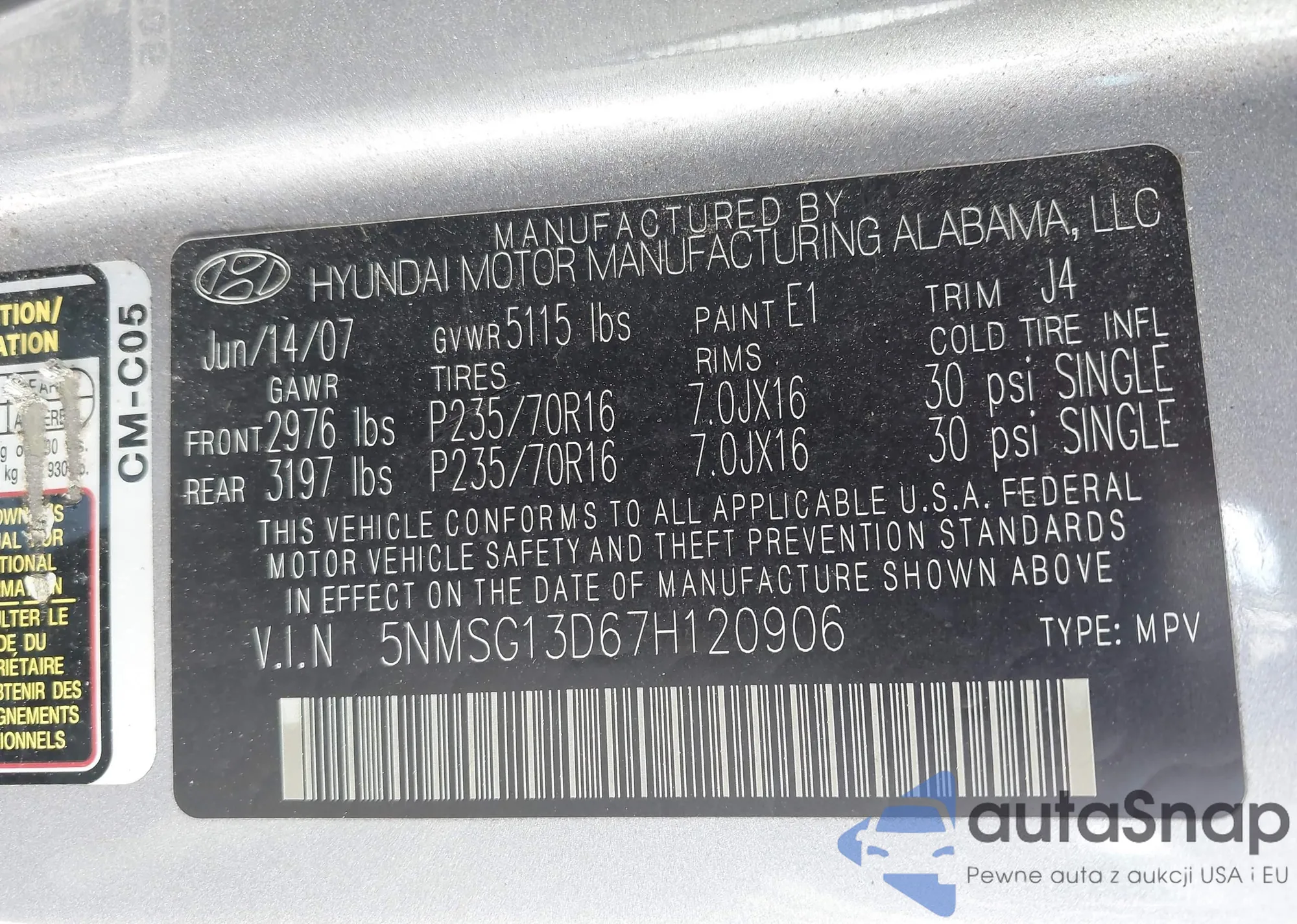 • VIN 5NMSG13D67H120906